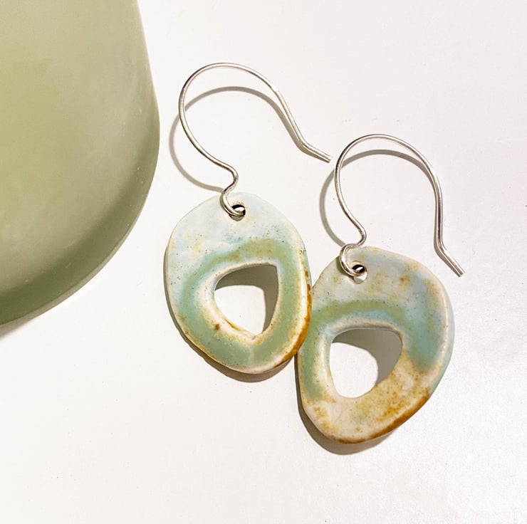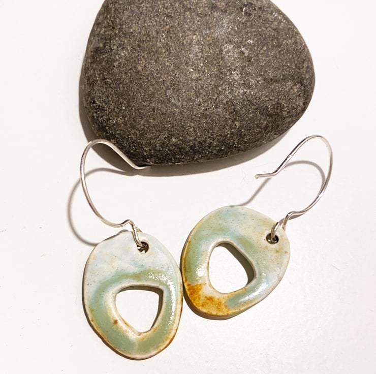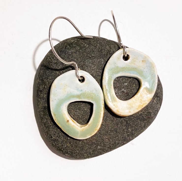 Sterling silver 10mm hoops with ceramic organic drops, hand glazed in shades of inspired by Norfolk beaches. The earring including the hoop measures 28mm in length and 12mm width. Each earrings is glazed on both sides and will be sent in a Walrus Ceramics grey presentation box.