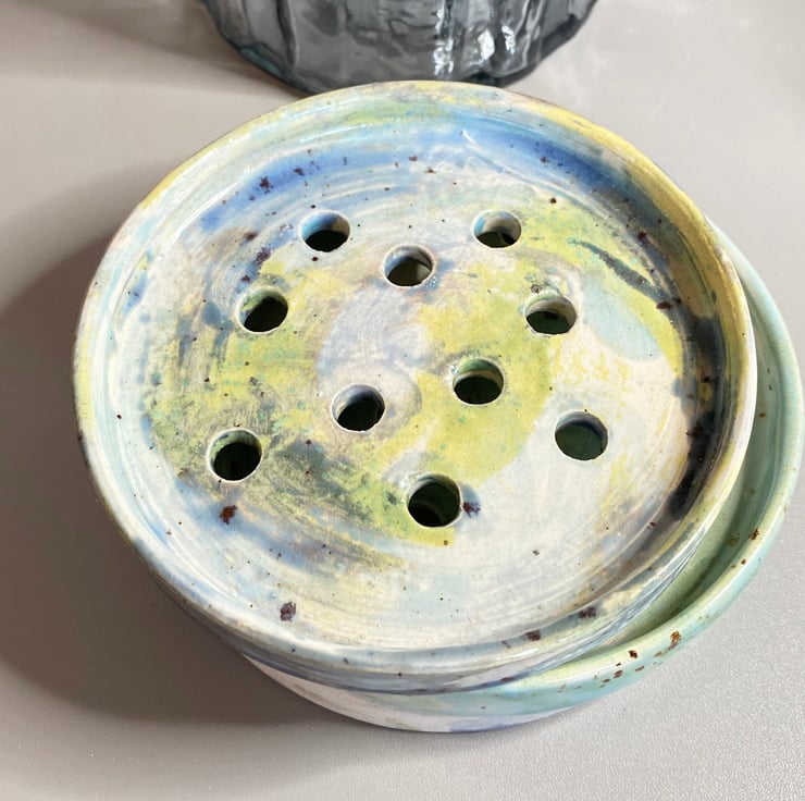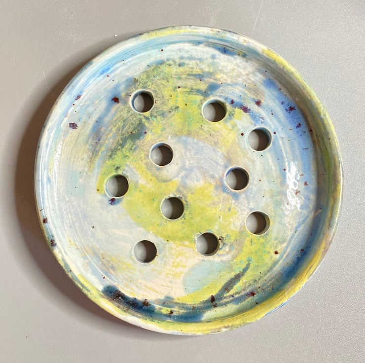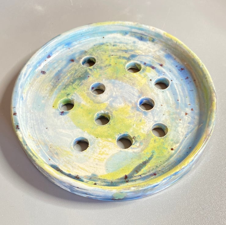 Each soap dish is individually glazed using colours and textures which are inspired by the beautiful area I live in and trips to the Norfolk coast. It has a diameter of 10cm and a height of 1.2cm, perfect for the smallest room in the house!
