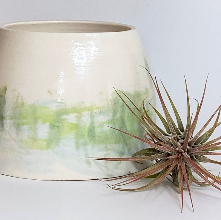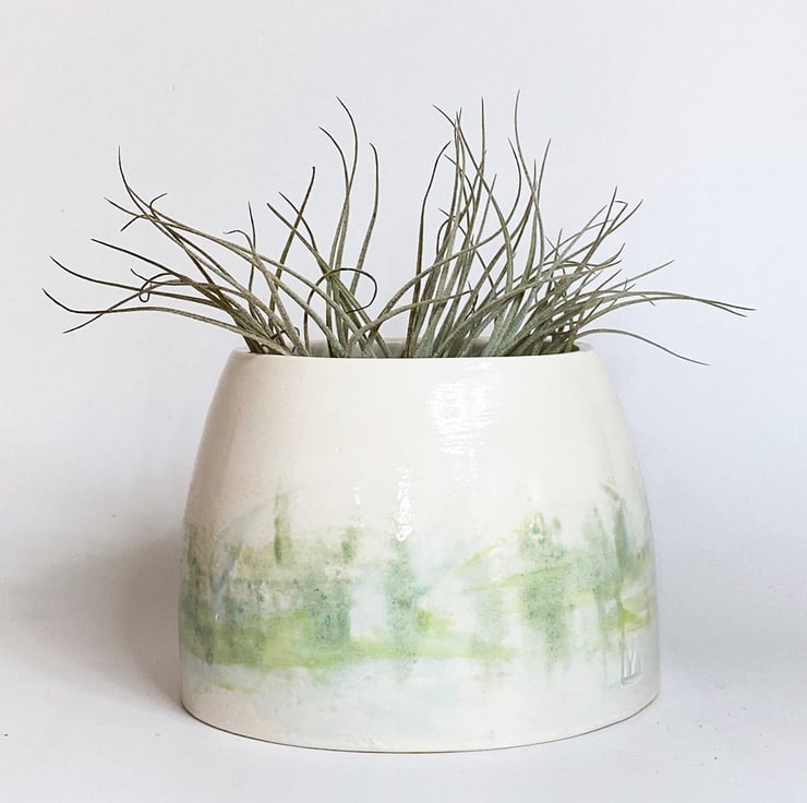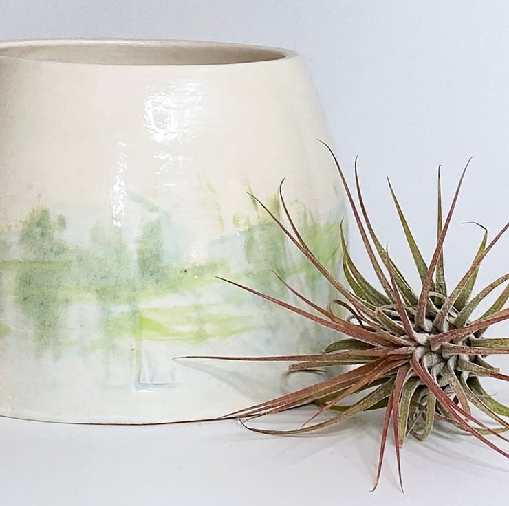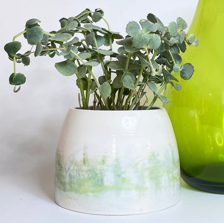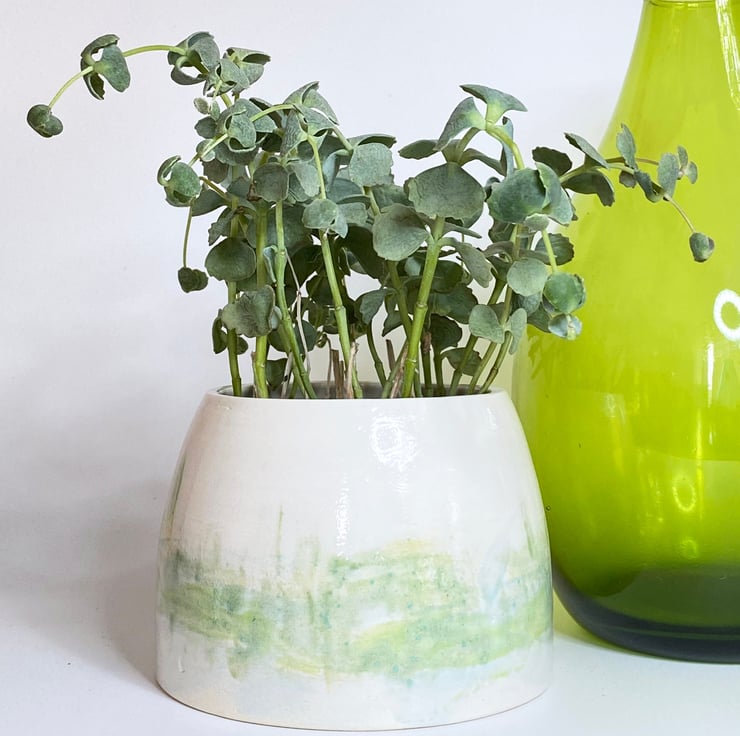 My glazing is strongly influenced by the countryside in Norfolk where I live. I glaze my ceramics by hand, painting with small paint brushes and so once the kiln works its magic, each item is unique. This planter has been hand made, thrown on the wheel and glazed by hand in shades of green, inspired by the Norfolk countryside.