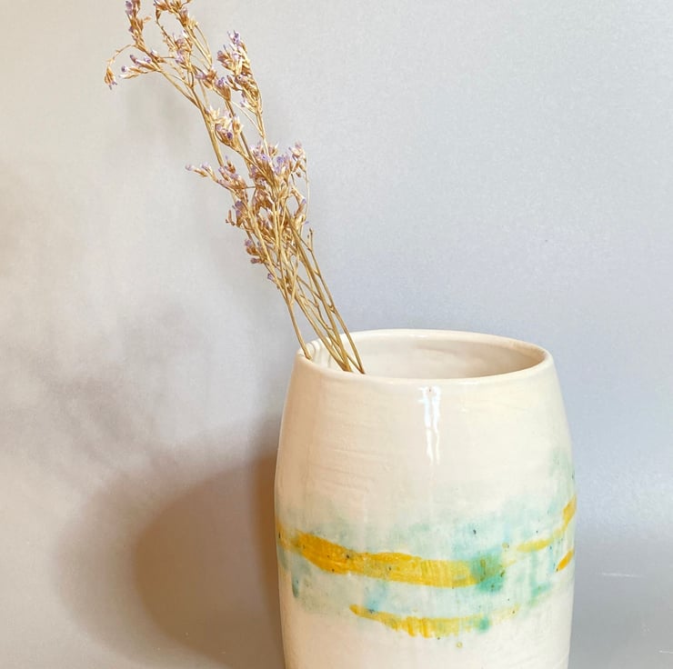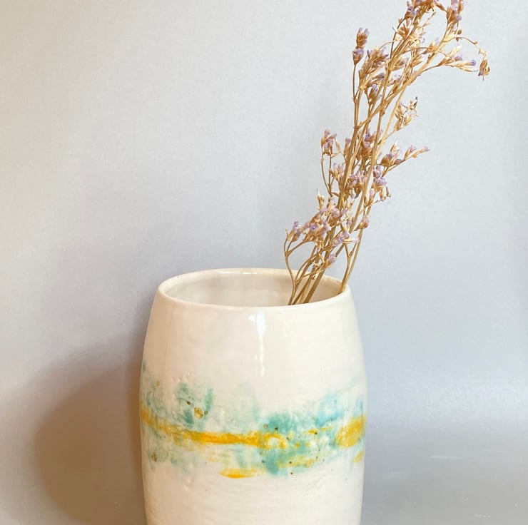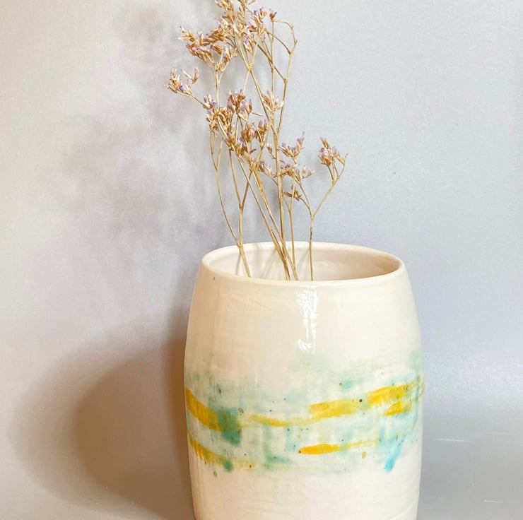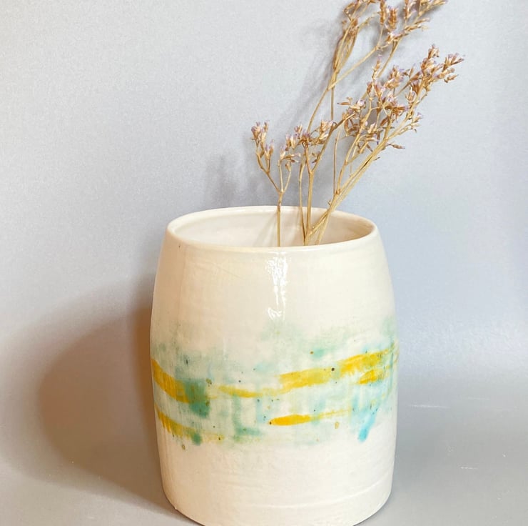 This planter has been thrown on the wheel and glazed in a painterly style by hand in shades of green, blue and yellow ochre, inspired by the Norfolk coastline.