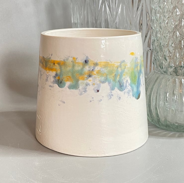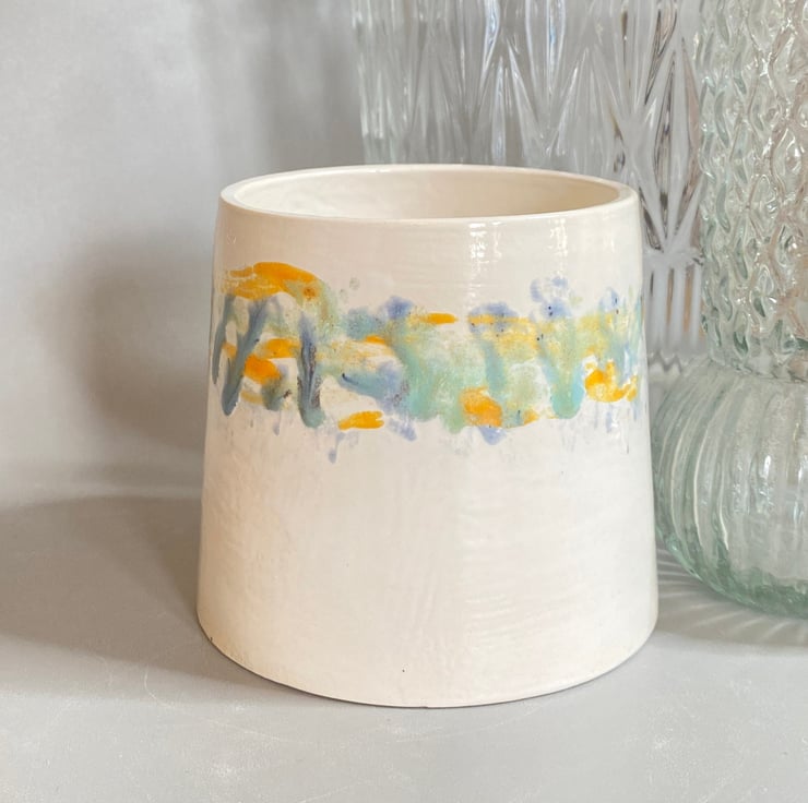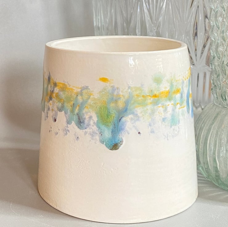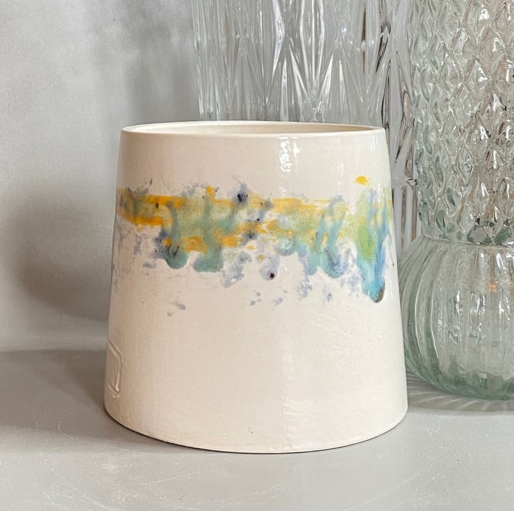My glazing is inspired by the colours found at the beach and countryside in Norfolk where I live. I glaze my ceramics by hand, carefully painting with small paint brushes and so once the kiln works its magic, each item is unique. This planter has been thrown on the wheel and glazed in shades of green blue and yellow ochre, inspired by the Norfolk coastline.