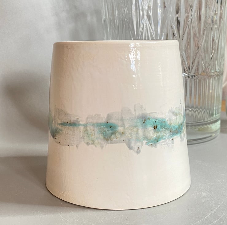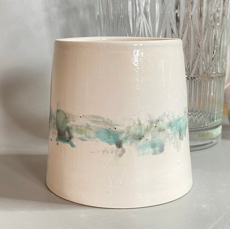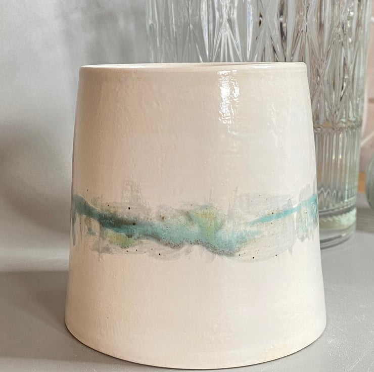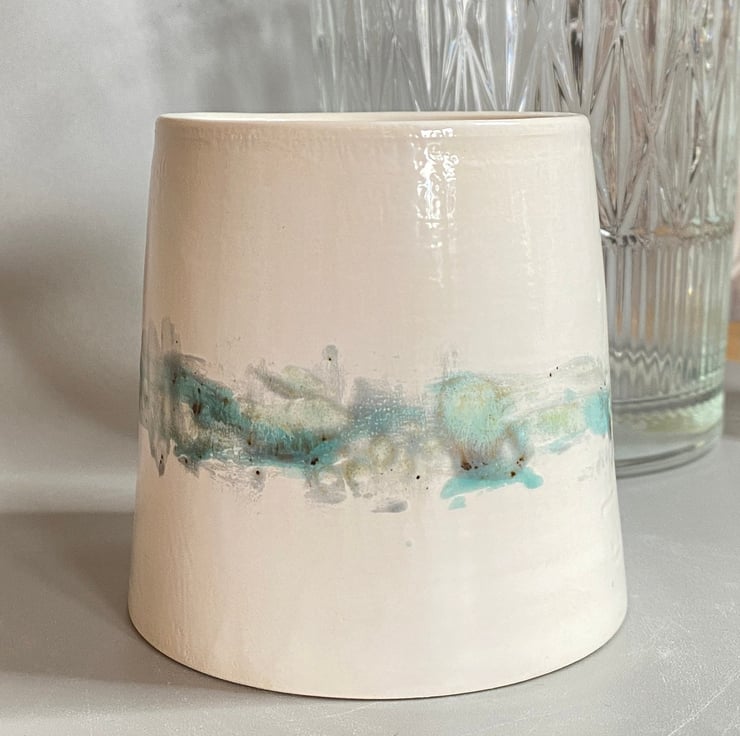 Hand made ceramic decorative pot painted by hand with glazes inspired by the Norfolk countryside and coast. This was thrown on the wheel and glazed in a painterly watercolour style by hand in blues and green -inspired by the sea and the Norfolk coastline. It has a top diameter of 8cm widening to 9cm at the base and stands at a height of 9 cm.