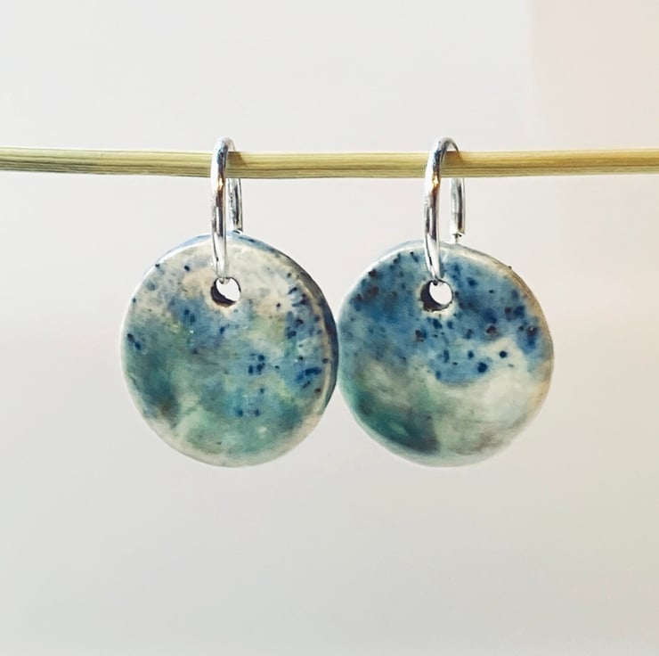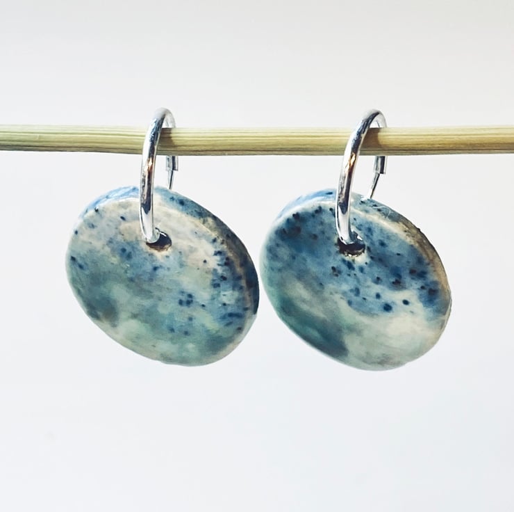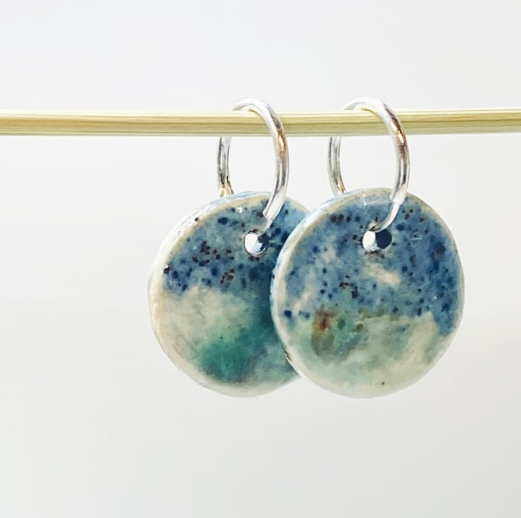 These earrings have 10mm sterling silver hoops with ceramic round drops, hand glazed in shades of blue. Every piece I make is glazed by hand and so no two pairs are the same I am inspired by the colours from the Norfolk countryside and beaches near where I live.