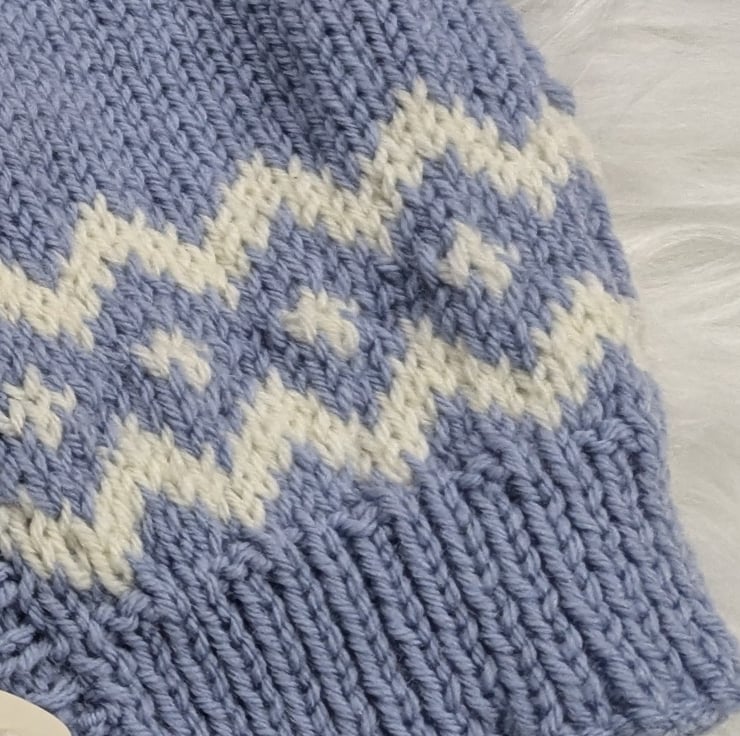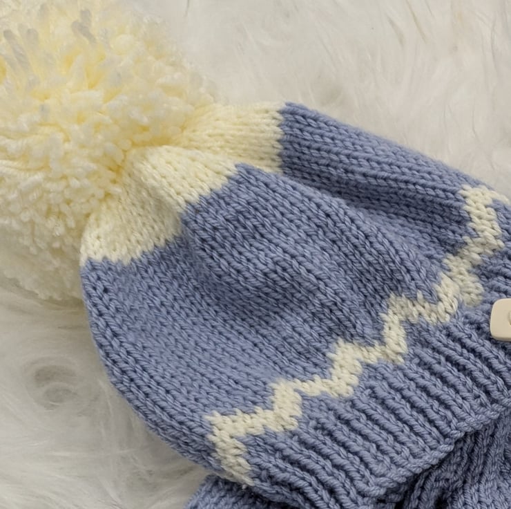 The matching hat has a cream pom pom l and a button decoration on the rib to match the cardigan
