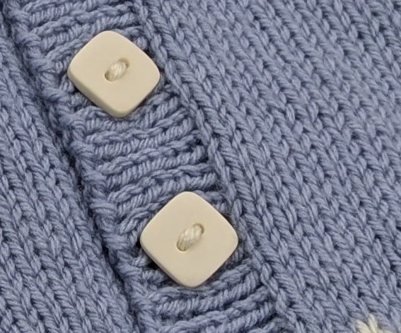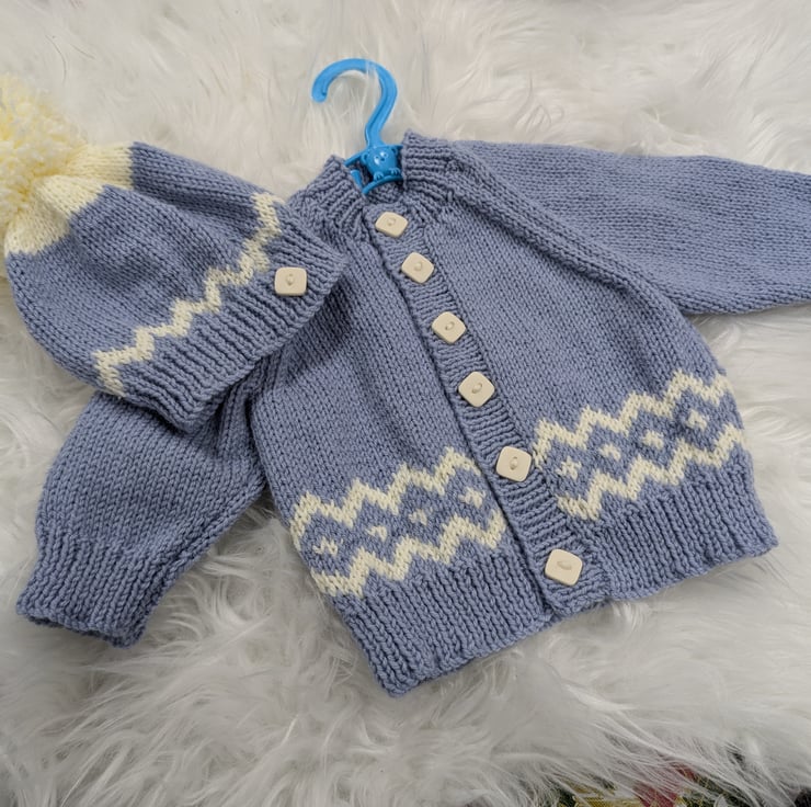 It consists of a cardigan with round neck and 6 diamond shaped buttons to match the fair isle pattern which is in cream