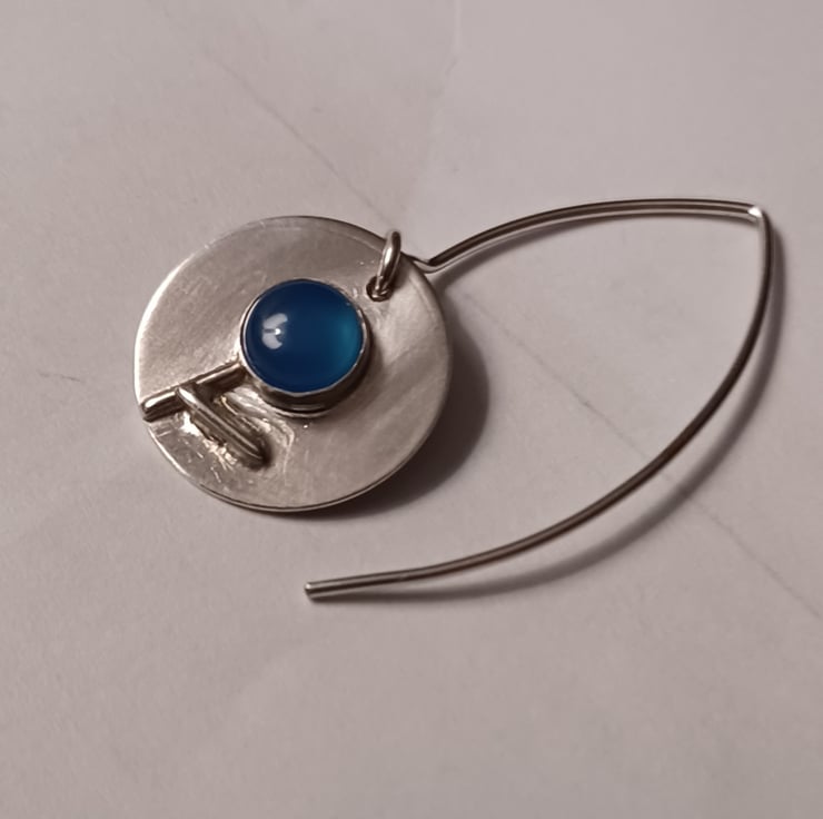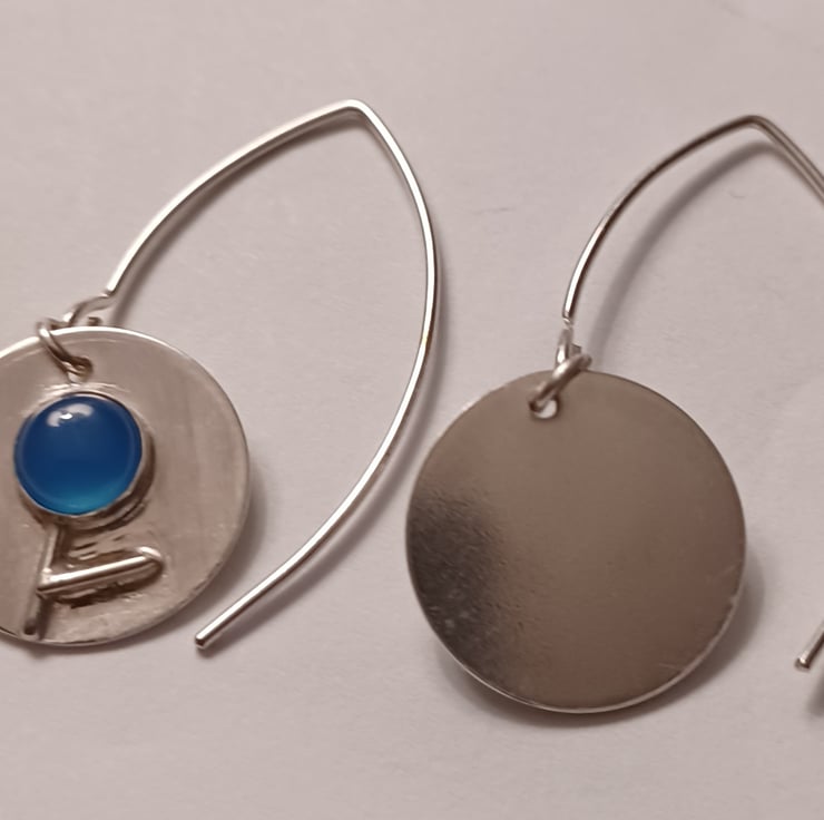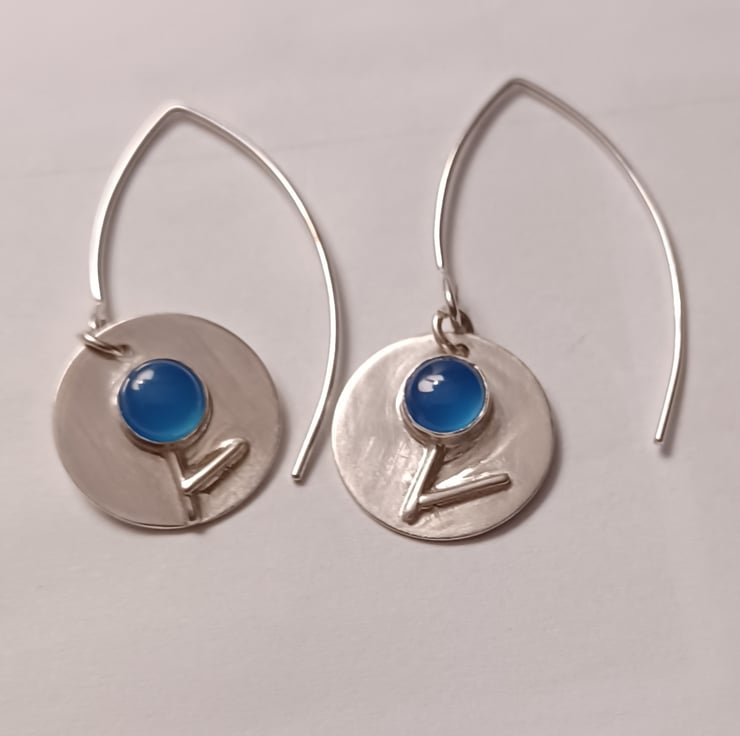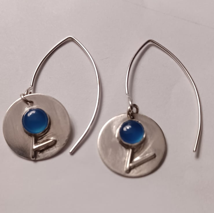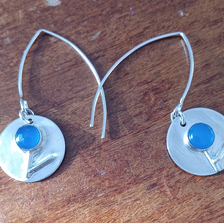 A pair of mid mod style blue flower earrings. The flowers are made from small blue chalcedony cabochons set onto sterling silver circles. The circles hang from handmade sterling silver earwires.