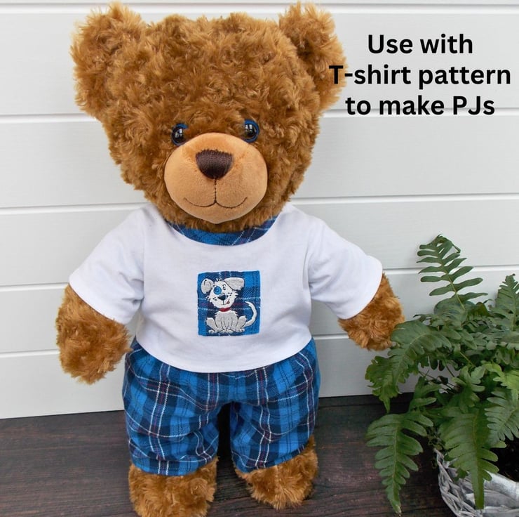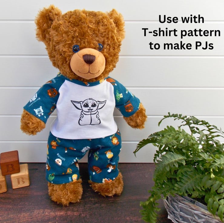 Sew an adorable pair of teddy bear trousers with our easy-to-use sewing pattern. Designed for beginners, the teddy bear trousers will fit 16-18 inch teddy bears, such as Build a Bear. Pair with a t-shirt pattern to make cute PJs!