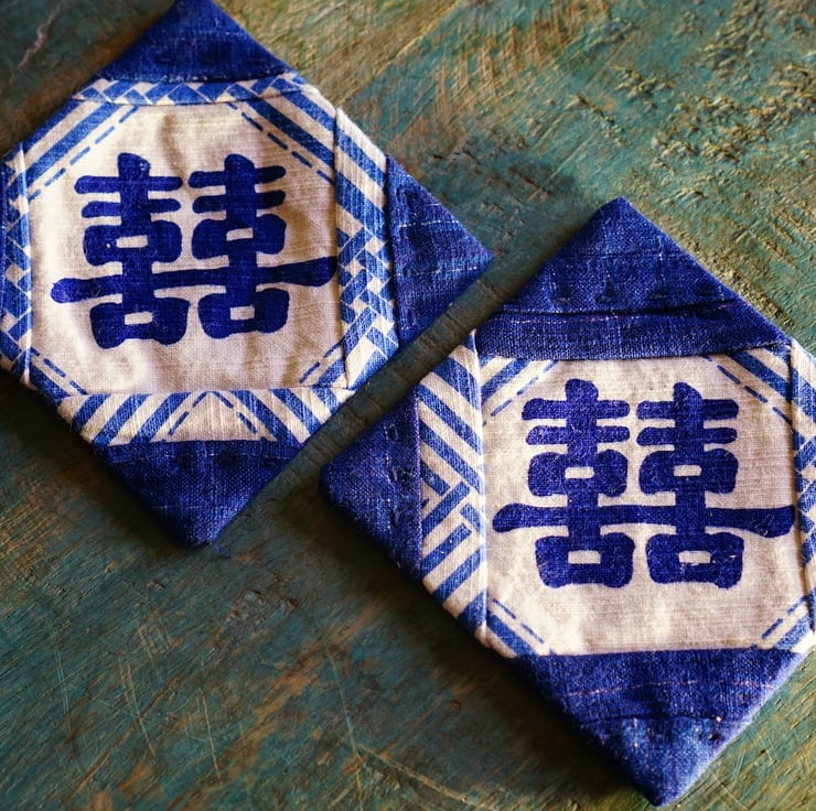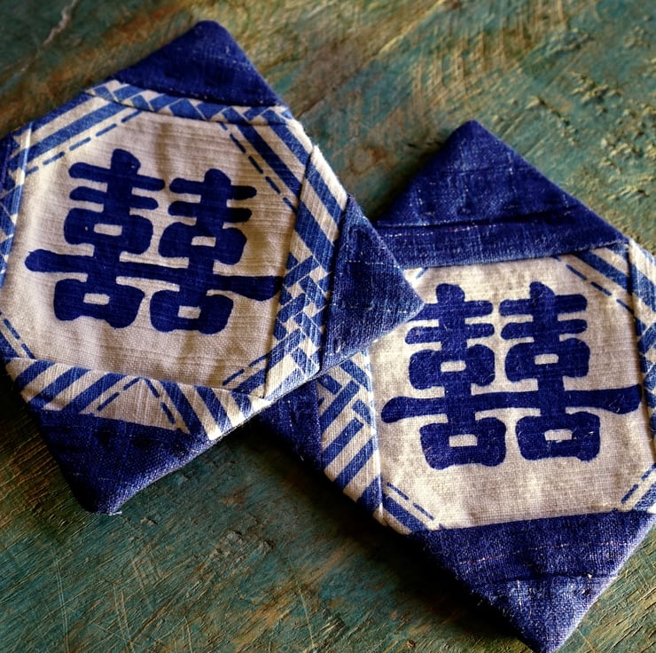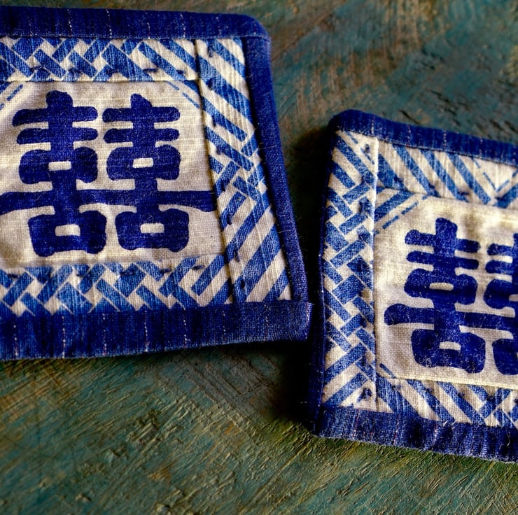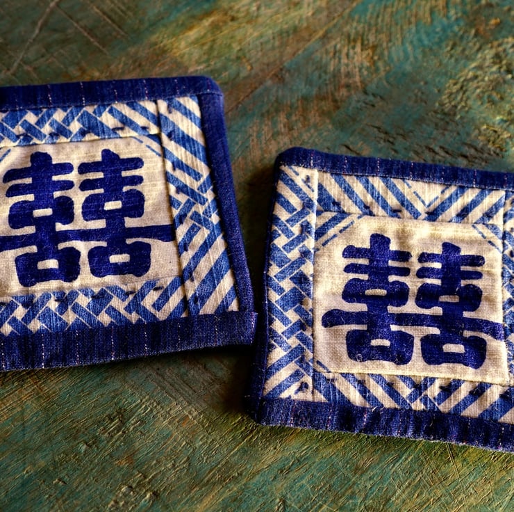 Gift a touch of heritage and warmth with this pair of handmade coasters. Adorned with the iconic "double happiness" motif, these coasters symbolize joy, love, harmony, and good fortune. Made from scraps of the double happiness handprinted cotton and vintage handwoven cotton, making them truly one of a kind. Deliberately to fully utilize the scraps without making the pair perfectly identical, presenting a sense of imperfect beauty. Ideal for bringing tradition and warm wishes to any home, they’re a heartfelt gift for your loved ones.