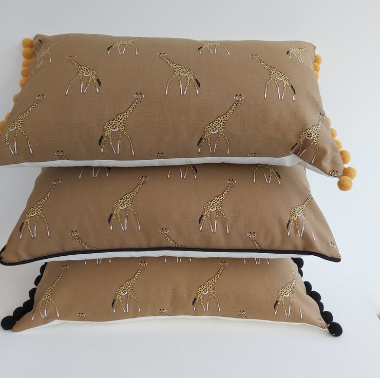 Sophie Allport giraffes fabric cushion with cream back and central zip and black pom poms