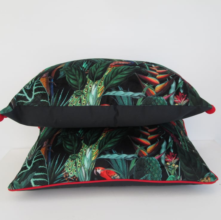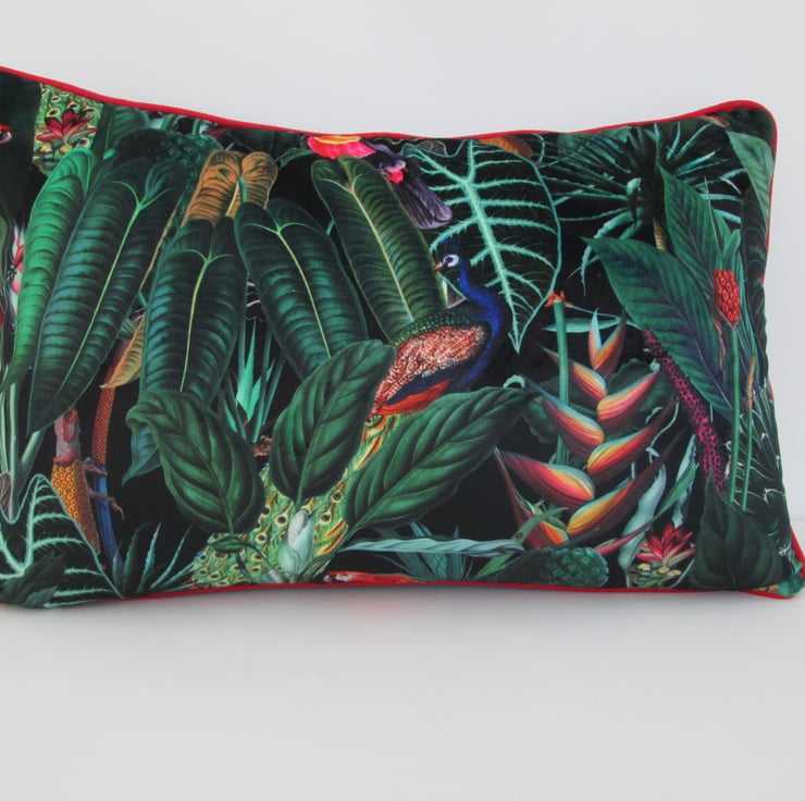Printed velvet jungle design cushion with lovely soft polyester inner zip and red piping