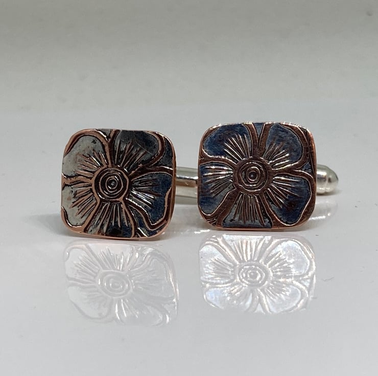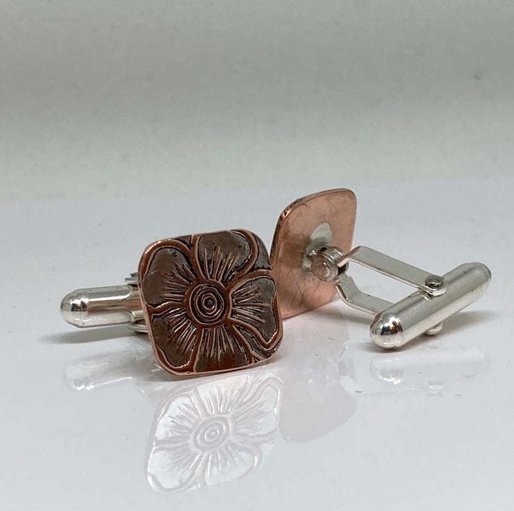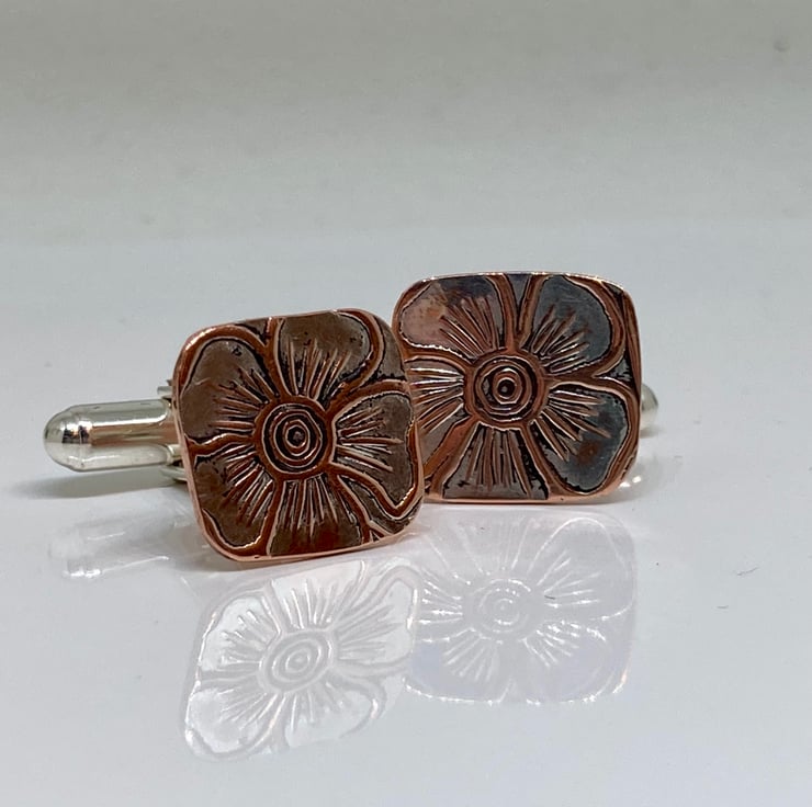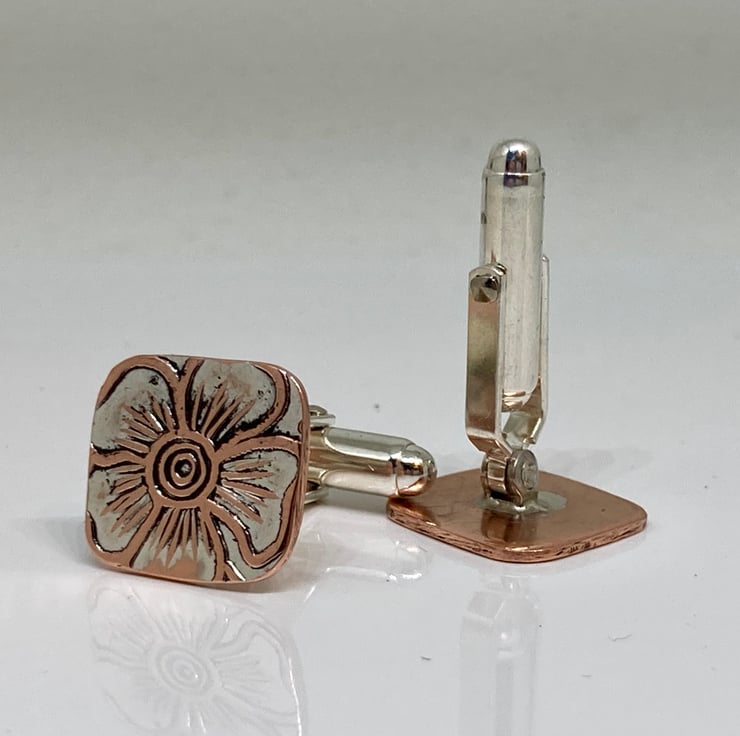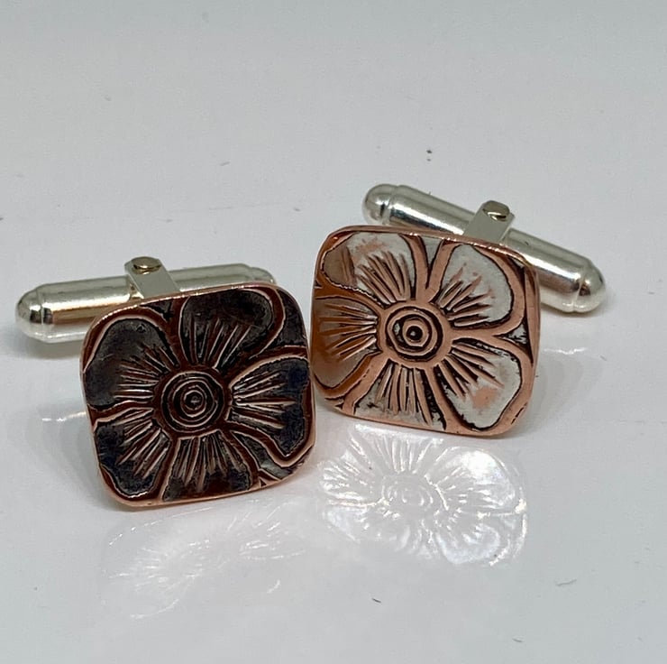 Cufflinks made from copper reclaimed from a silver plated copper tray. These have some silver plate left on the front, providing a contrast with the raised areas of the floral pattern, which have worn through to the copper. They are soldered onto sterling silver backs and would make a great present for a stylish gent who favours sustainable clothing and accessories.