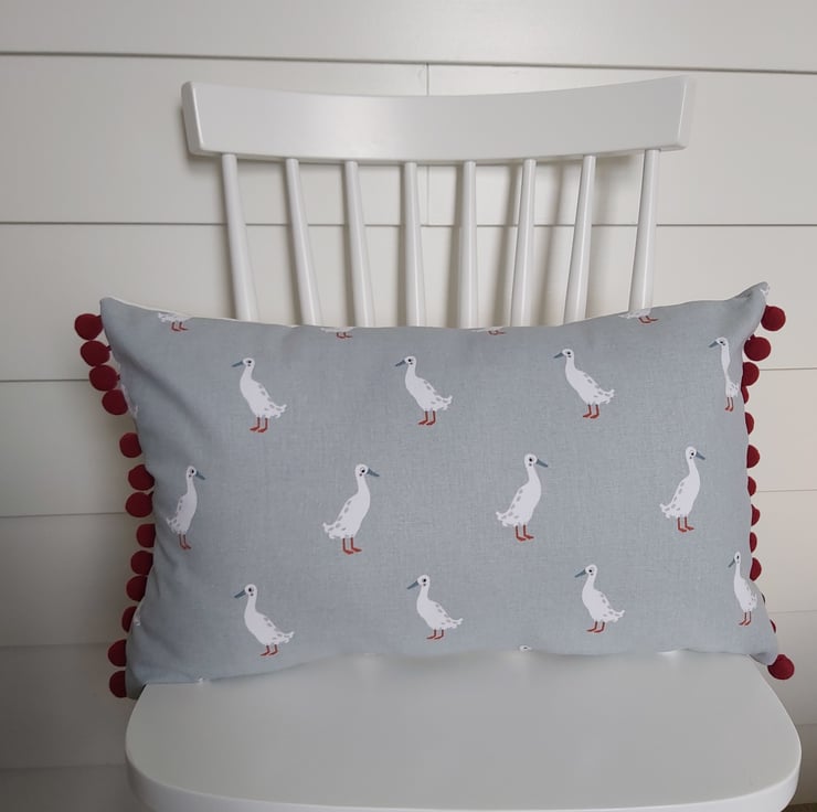 Sophie Allport ducks fabric cushion with cream back and central zip and red pom poms