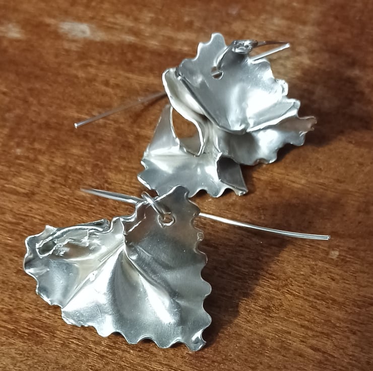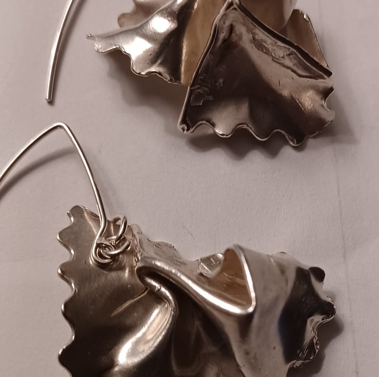 Unusual handmade "ravioli" earrings are formed from folded sterling silver with crimped edges. The "ravioli" hangs from sterling silver earwires. They measure approximately 2.5cm across, 1.5 in depth, and 3cm lin length. .