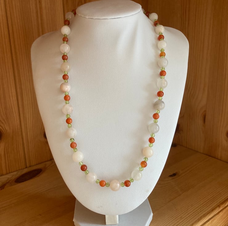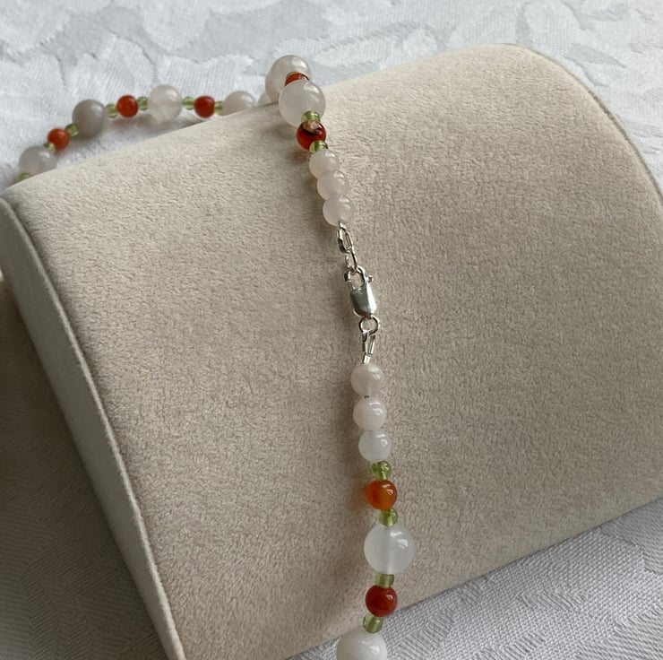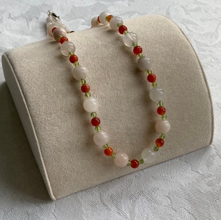 This necklace is made with Peach Aventurine, Peridot and Fire Agate secured with a sterling silver lobster clasp fastening.