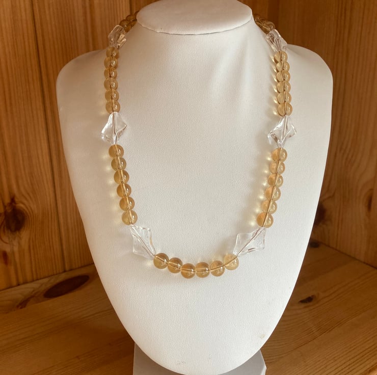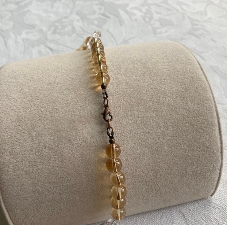 This necklace is made with champagne coloured glass beads and clear glass beads. Secured with a copper lobster clasp fastening.