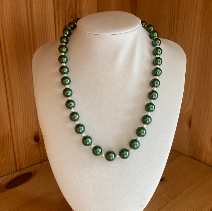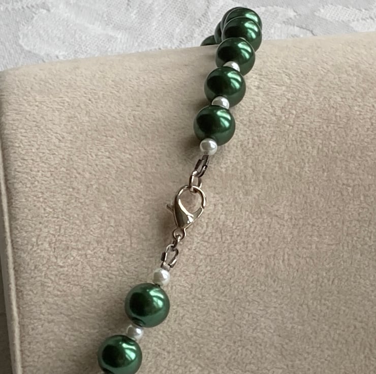 This necklace is made with green glass pearls interspersed with small white faux pearls, secured with a silver plated lobster clasp fastening.