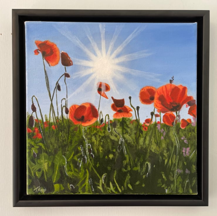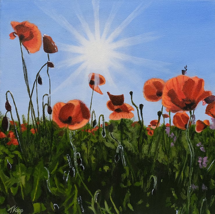 An original oil painting of a field of bright red poppies reaching up in to a bright blue sky as a blazing sun beams down.