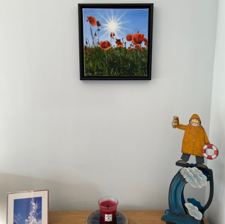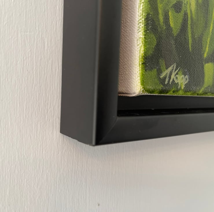 The painting has been varnished, and sits on a stretched canvas measuring 30cm x 30cm. It can be provided without a frame or provided mounted in a black floating frame from which the canvas can be removed if required. The frame size is 34.2 x 34.2 x 3.4cm. Also known as a tray frame, the canvas sits in the middle of the frame with a 5mm gap between the canvas and the frame. It is not glazed.