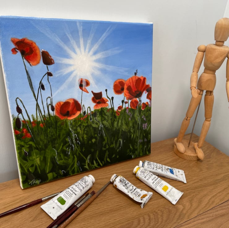 I was drawn to paint this field of poppies by the rich contrasts between the bright blue sky, the deep green of the field and the vibrant red of the poppies.