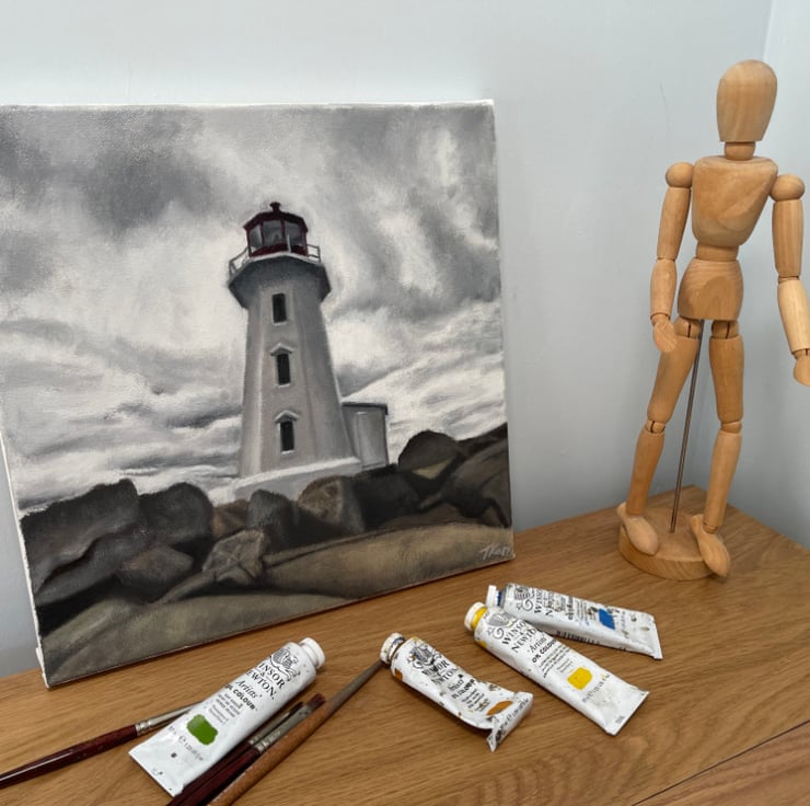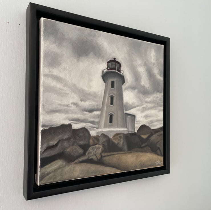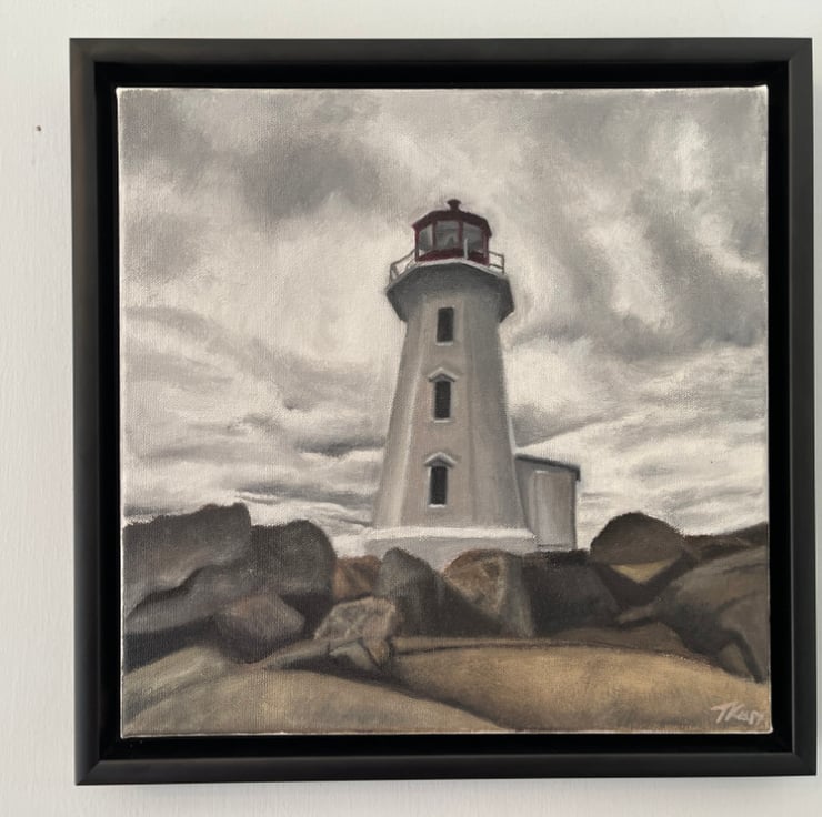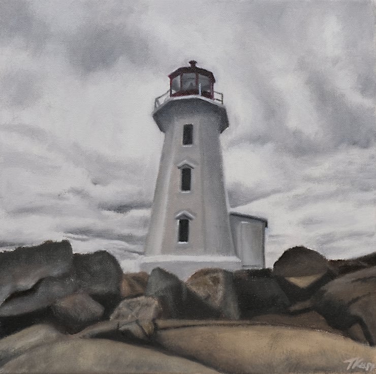 An original oil painting of a white lighthouse standing tall above the large, imposing rocks it warns mariners to be wary of. Behind it, a grey cloud-filled sky hangs heavy and expectant, as if warning the lighthouse to expect the worst.