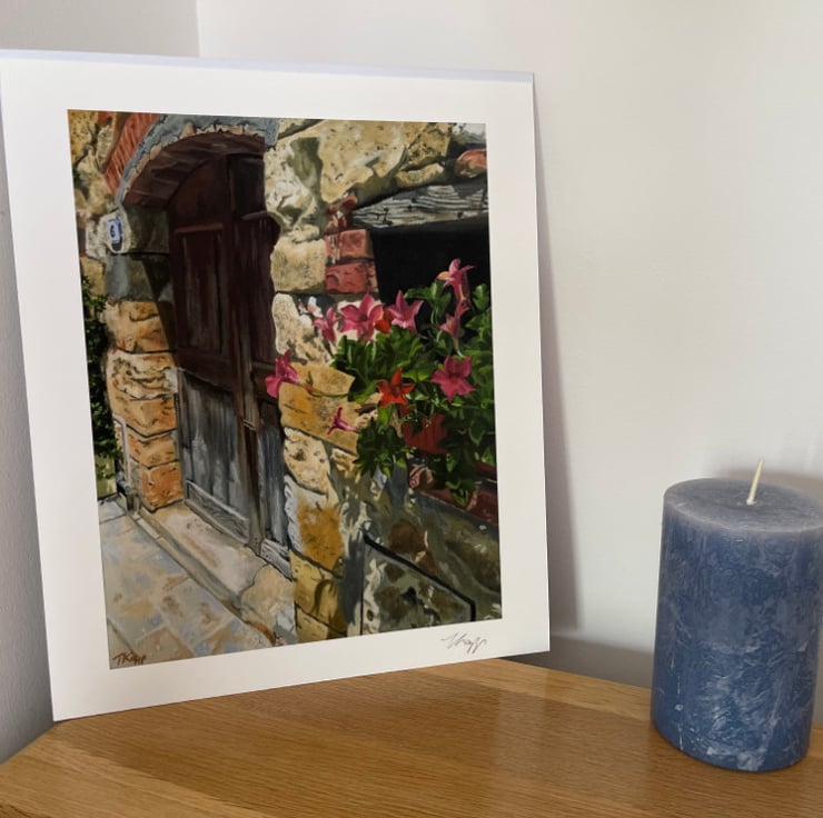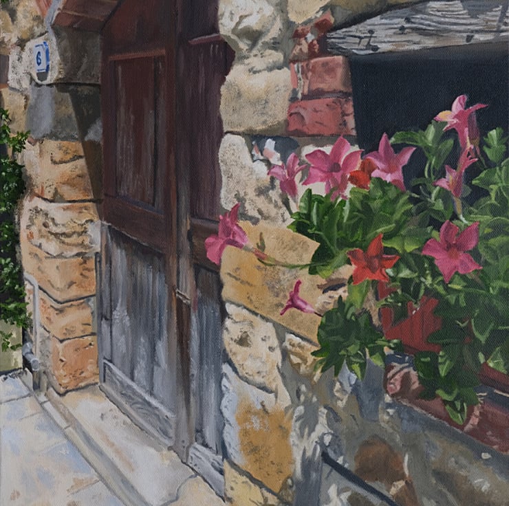 A signed fine art print of an original oil painting of a weather-beaten door somewhere in Tuscany. In the foreground a spray of bright flowers bursts from a window box. They seem to be reaching out for the sun, while the door sits half in shadow, as if retreating from the searing heat of the day.