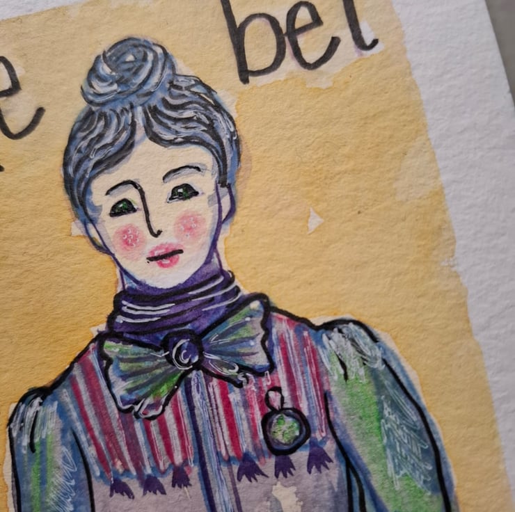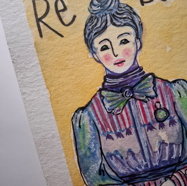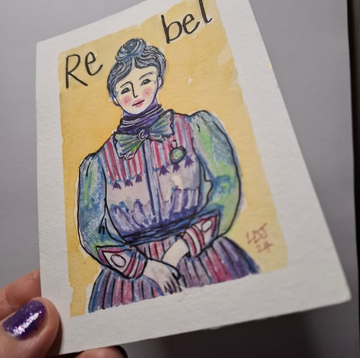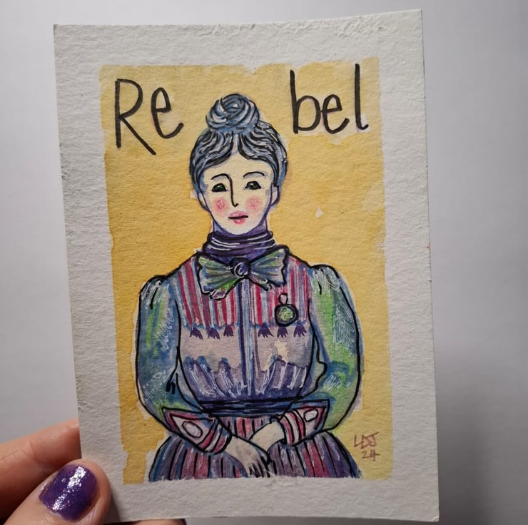 I was inspired to paint this image when I viewed a Victorian photograph of a shop girl wearing a badge. She looked like she could cause some serious trouble because she looked smart and strong minded. I began to wonder about the badge she was wearing and what it could mean. Before i knew it I was imagining her as a suffragette and in a couple of hours this painting was finished.