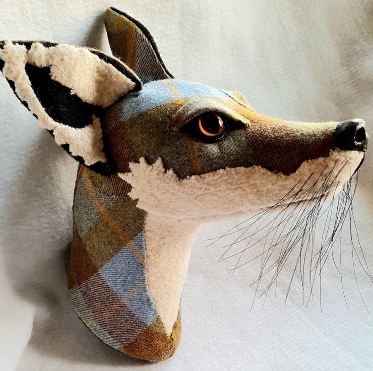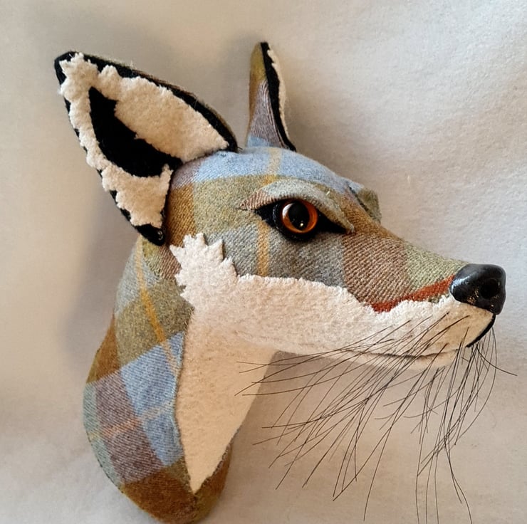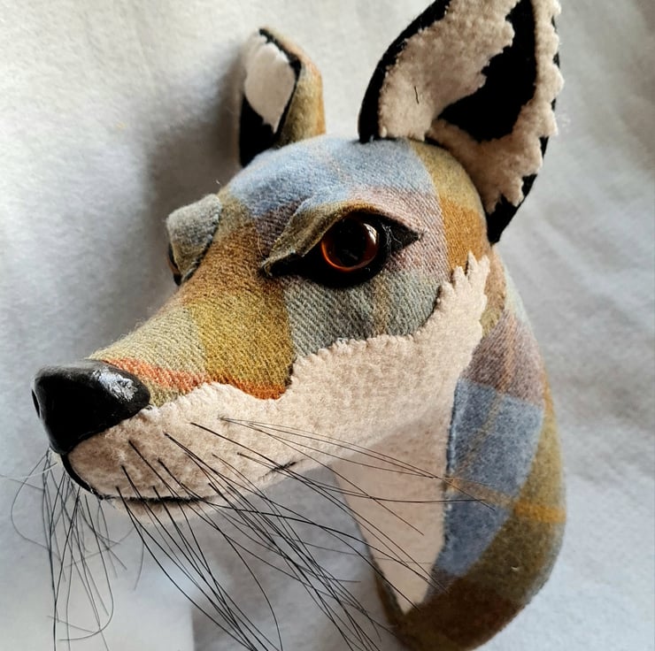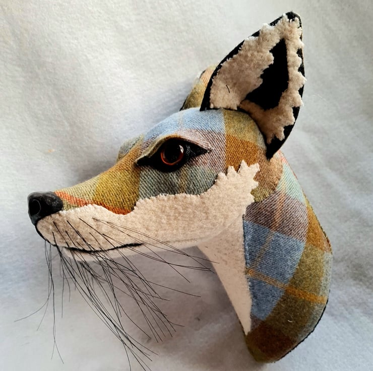 A lifesize faux fox head which I have handmade and covered in hand stitched tartan fabric. The white wool fabric is upcycled from a vintage blanket. The nose is handmade from polymer clay. The head is backed with felt and has a metal hanger to hang it on the wall. It is lightweight.