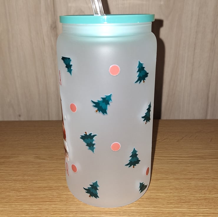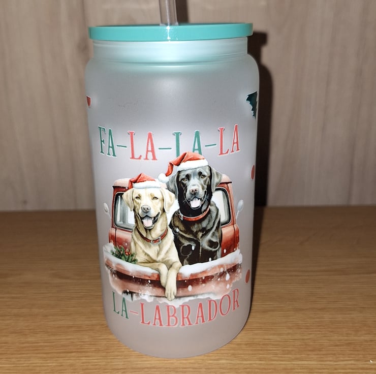 CLEARANCE - Enjoy a drink in this frosted glass Libbey can featuring a Christmassy Labrador Dog Breed Design, with a 16oz capacity.
