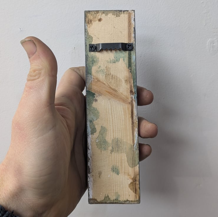 This one measures 4x16cm and has a metal fixing on the back allowing it to be hung directly onto a wall using a small nail or screw.