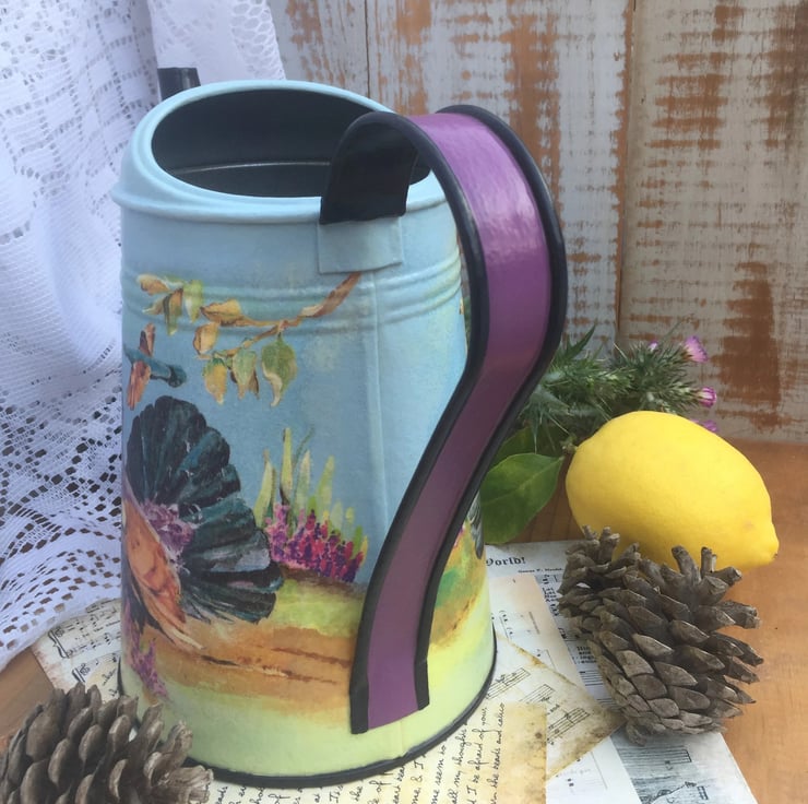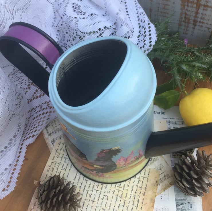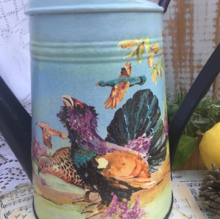Add a touch of rustic elegance to your home or garden with this galvanised metal watering can, featuring a stunning capercaillie bird design crafted using the decoupage technique. Finished with a water-based matte varnish, this unique piece develops a natural patina over time or when exposed to sunlight, enhancing its vintage charm.