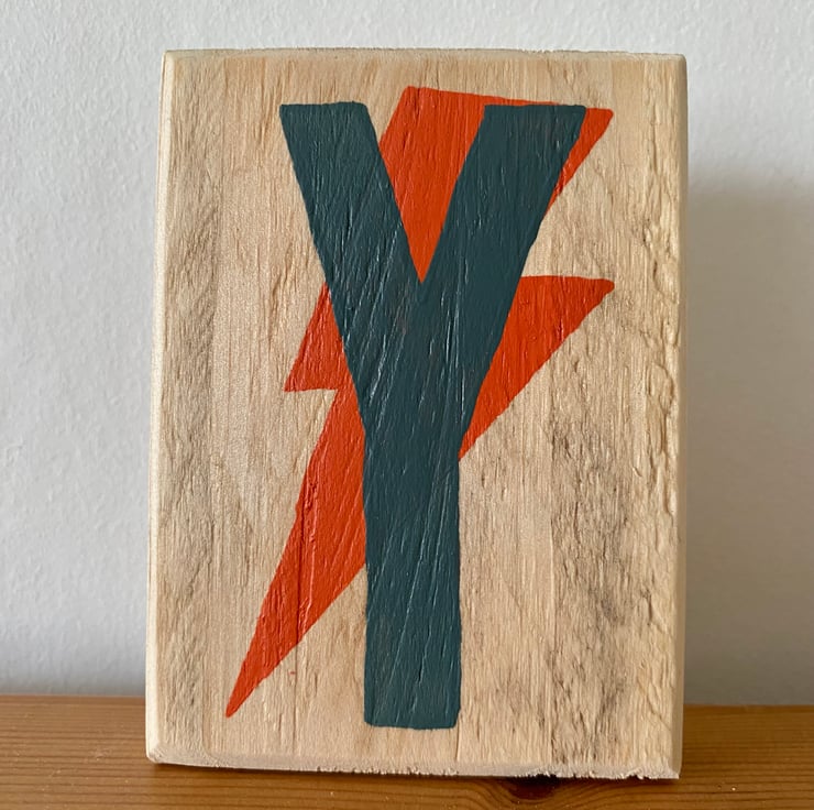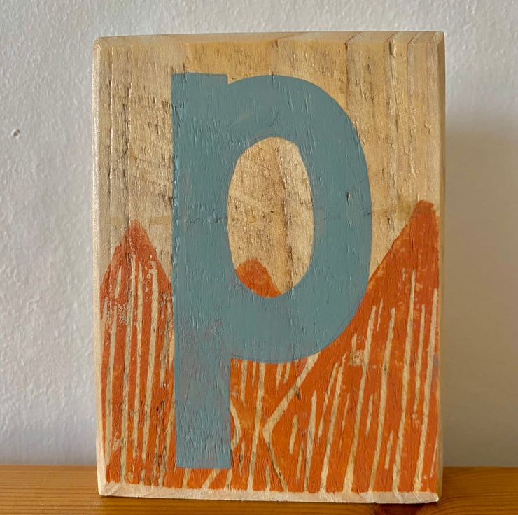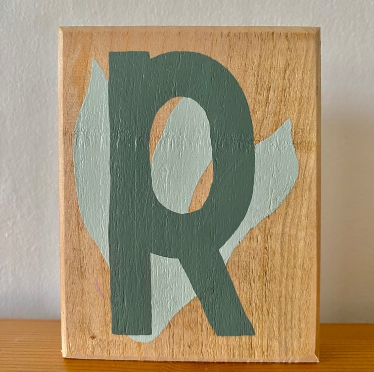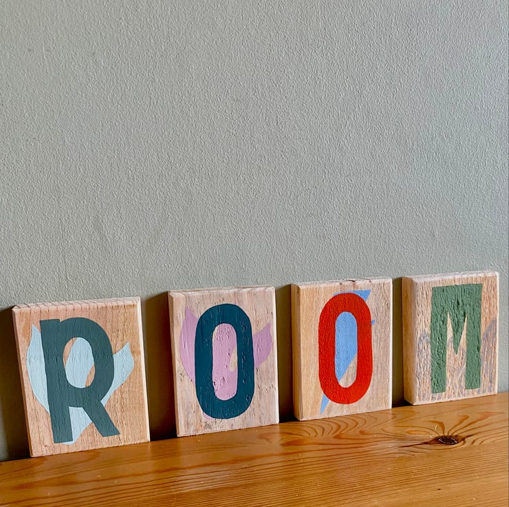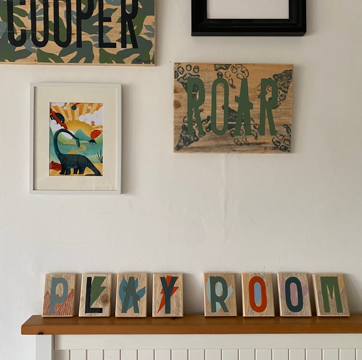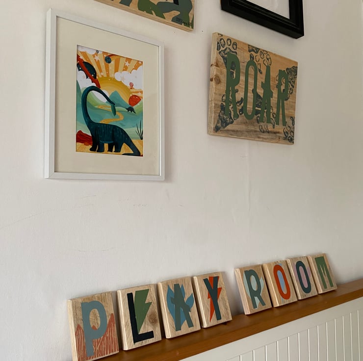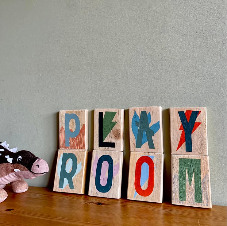 Beautiful multi mini design letter blocks spelling out PLAY ROOM. Featuring a mix of dinosaur footprints, lightning bolts and stegosaurus backplates in an array of F&B colours including calke green, red earth, stone blue and inchyra blue.