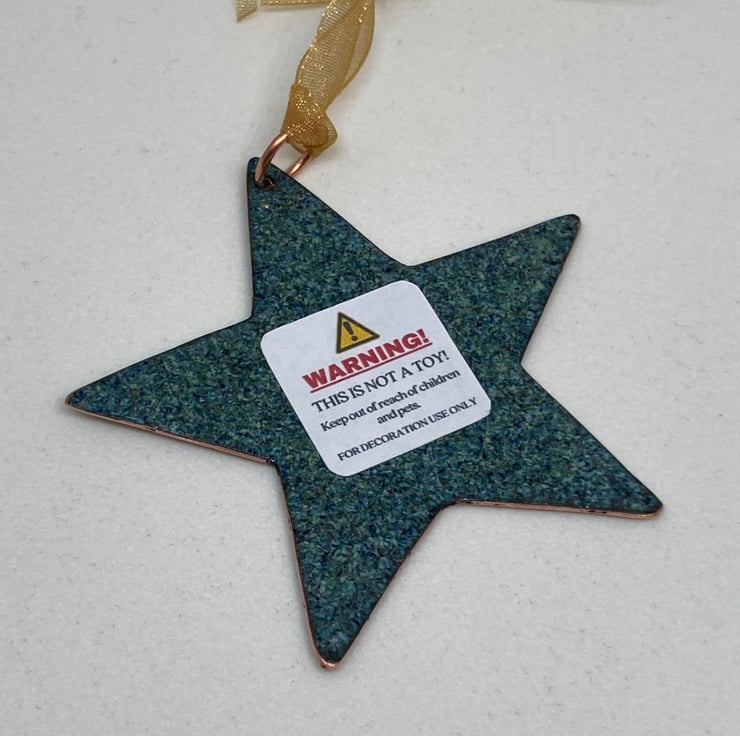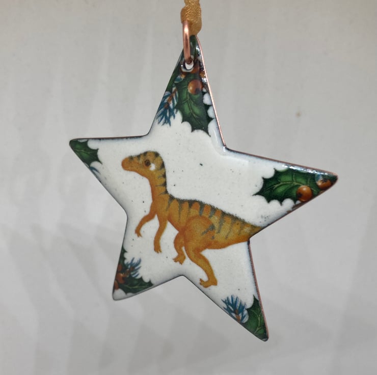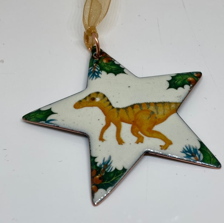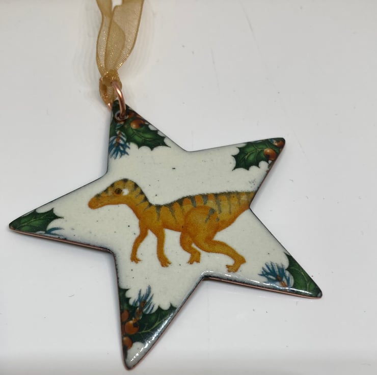 Dinosaur themed hanging decoration for your Christmas tree. This star is made from enamelled copper, is green on the back and ivory coloured on the front, which is decorated with an orange velociraptor and holly leaves. As each of these is made by hand, the exact leaf design may differ slightly from that shown