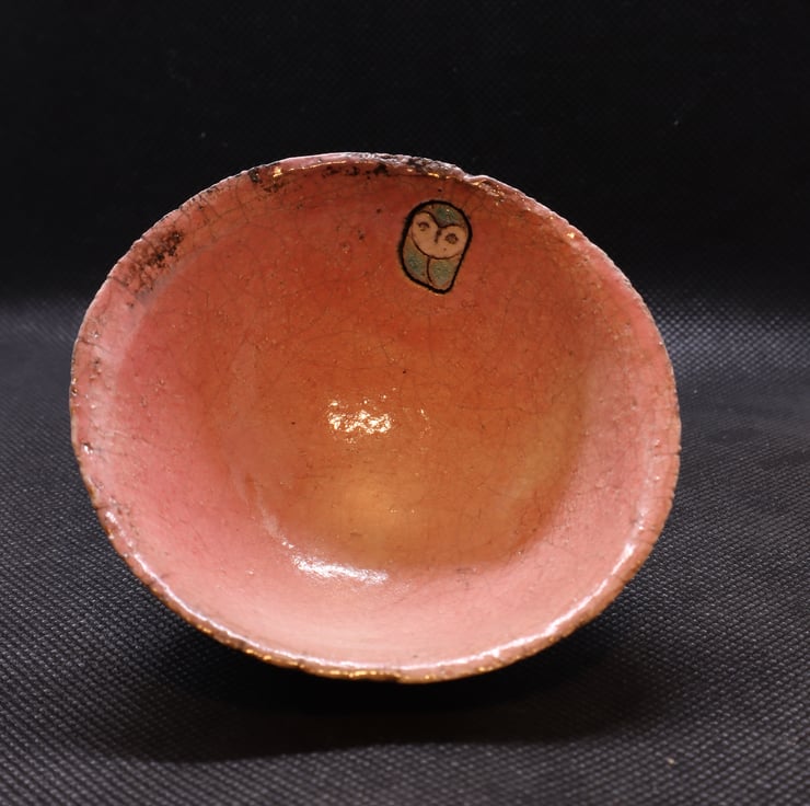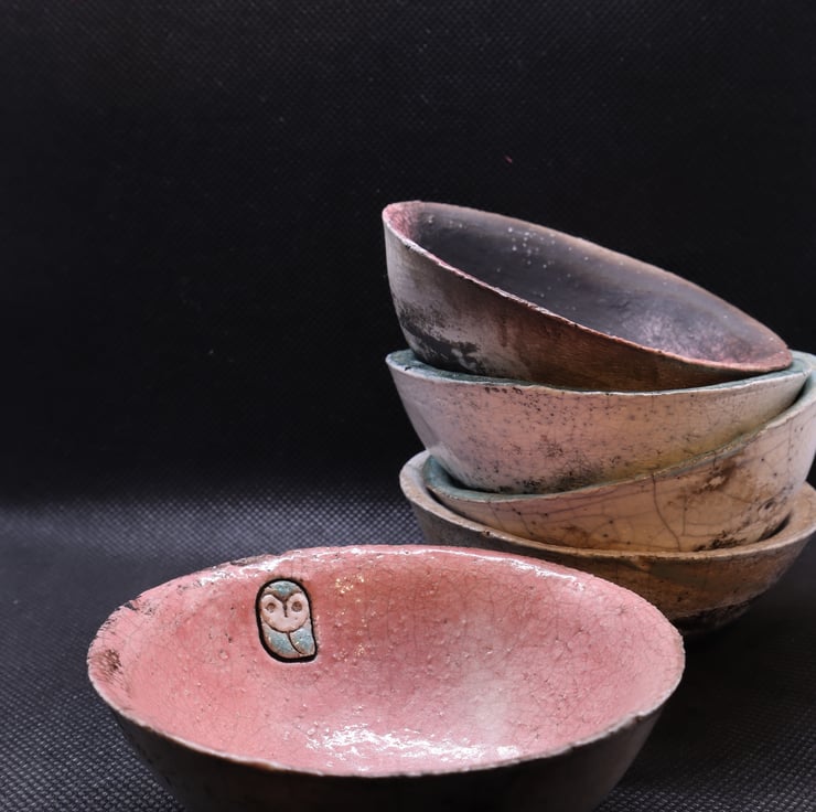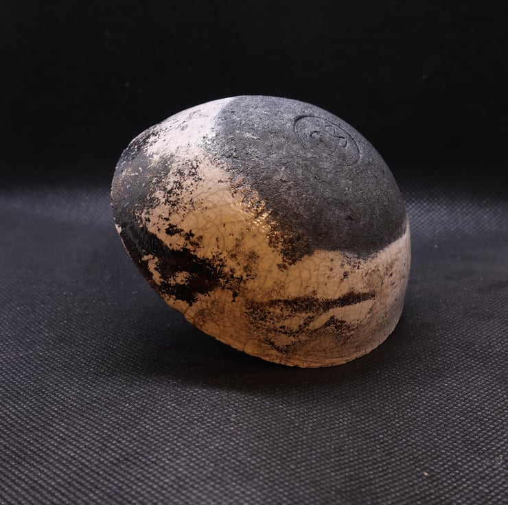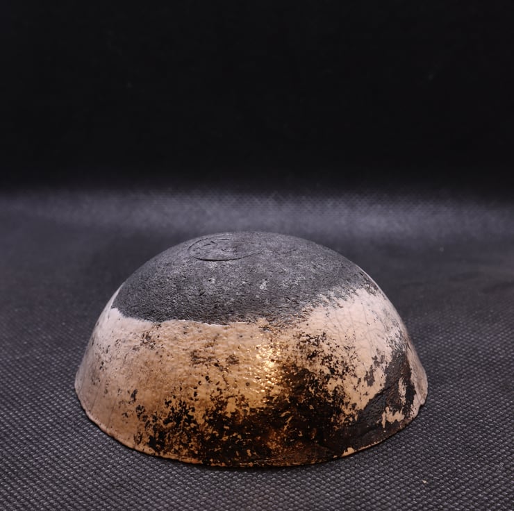 Handmade ceramic bowl. Made using the raku firing process. This involves exposing the glazed ceramic bowl to fire and a combustible medium (sawdust). The process results in each piece being totally unique. 9cm by 3.5cm. Not food safe.