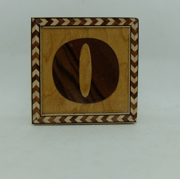 This is letter O, med brown wood letter with a light background and a border.