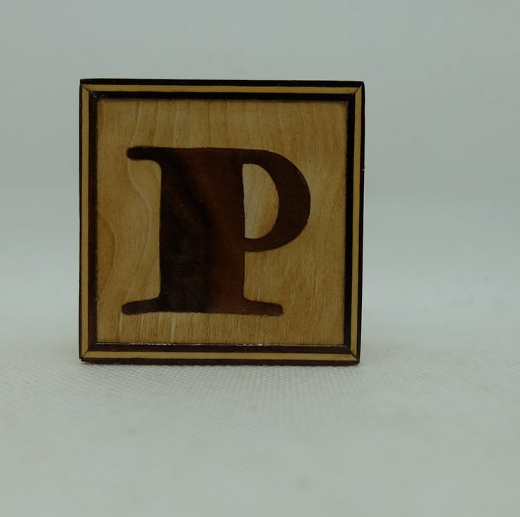 This is letter P, med brown wood letter with a light background and a border.