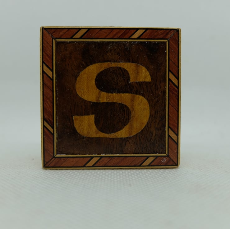 This is letter S, satin wood letter with a dark background and a border.