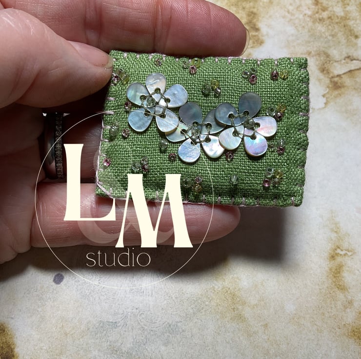 Pretty shell "beads"formed into delicate flowers, hand stitched on linen, lightly padded with felt reverse .