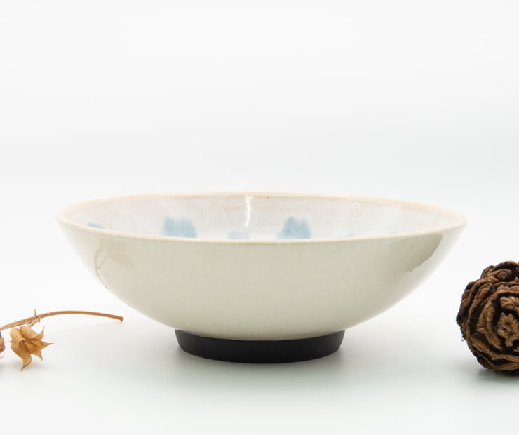 With a cream white base layer above and below, the upper surface has a subtle design using flowing blue and blue-grey glaze. The dish is finished off with black velvet underglaze on the foot ring.