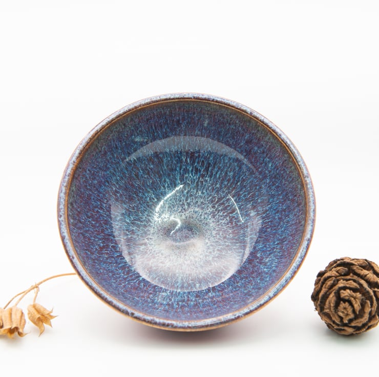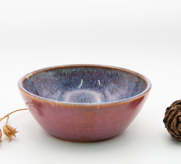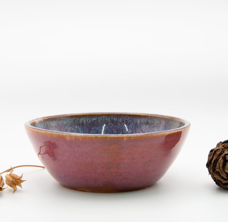 Decorated inside with a flowing glaze combination that produces rivulets of light blue, dark blue and purple. A contrasting chun plum glaze has been used on the outer surface.