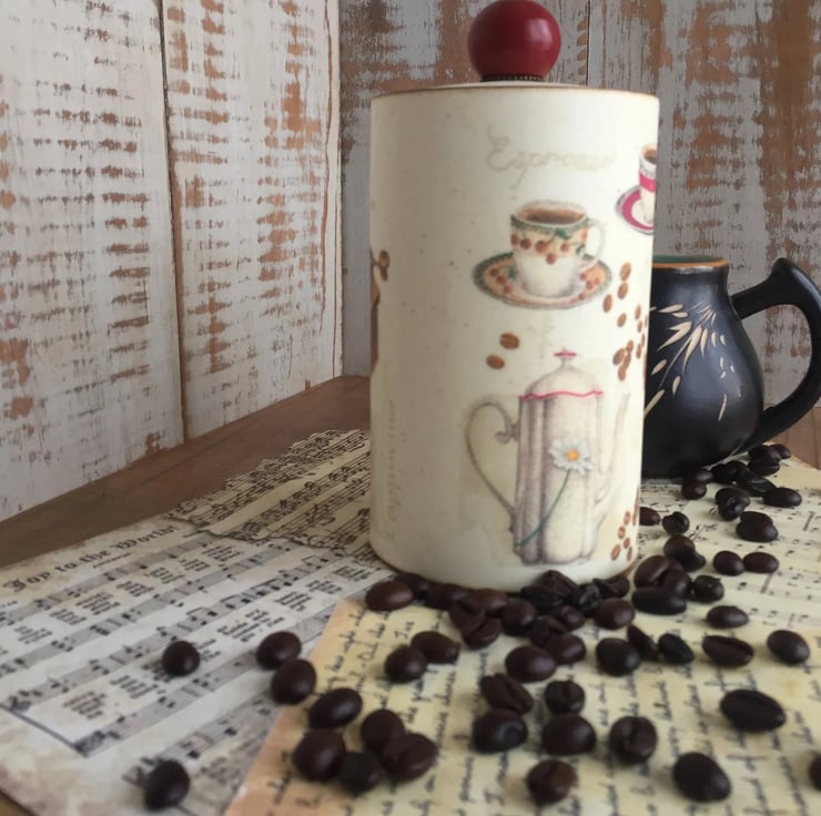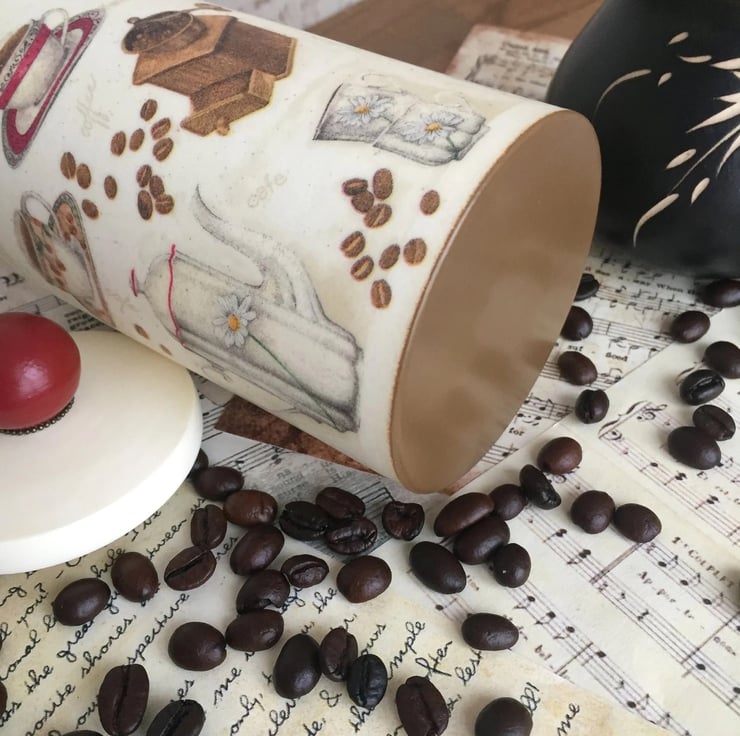 Store your coffee in style with this elegant wooden coffee canister, handcrafted from linden wood and decorated with a charming decoupage design. Perfect for holding coffee, tea, sugar, or other dry goods, the canister features an unfinished wood interior, ideal for preserving the freshness of your essentials.