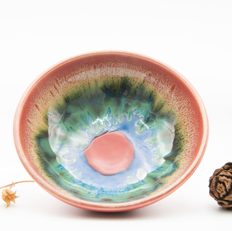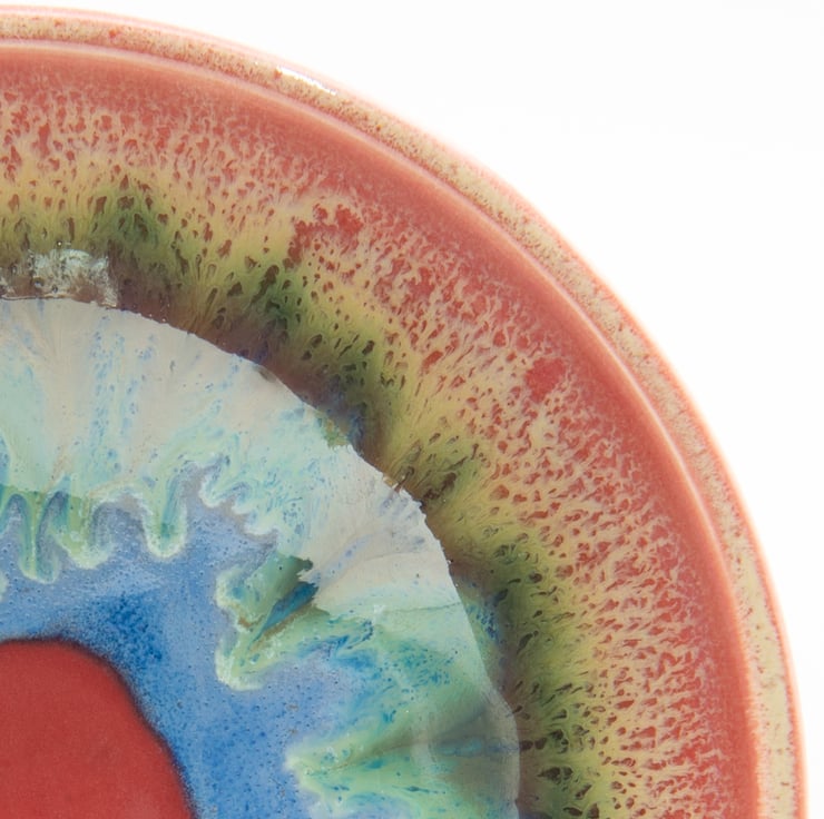 With a base of Snapdragon Red both inside and out, a dramatic design has been created inside by layering multiple glazes. The base red merges into yellow, green blue, bright blue and then back to red.The dish is finished with black velvet underglaze on the foot.