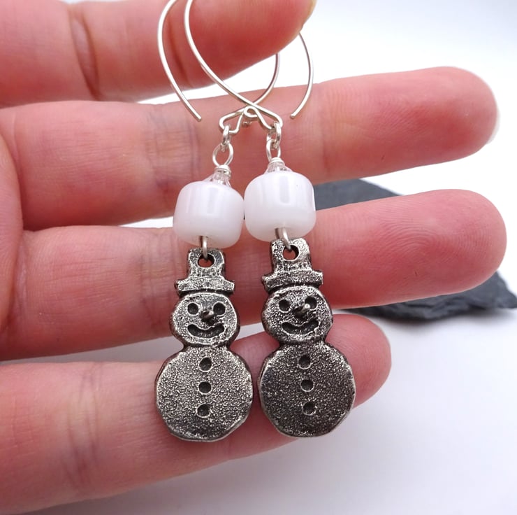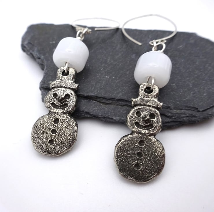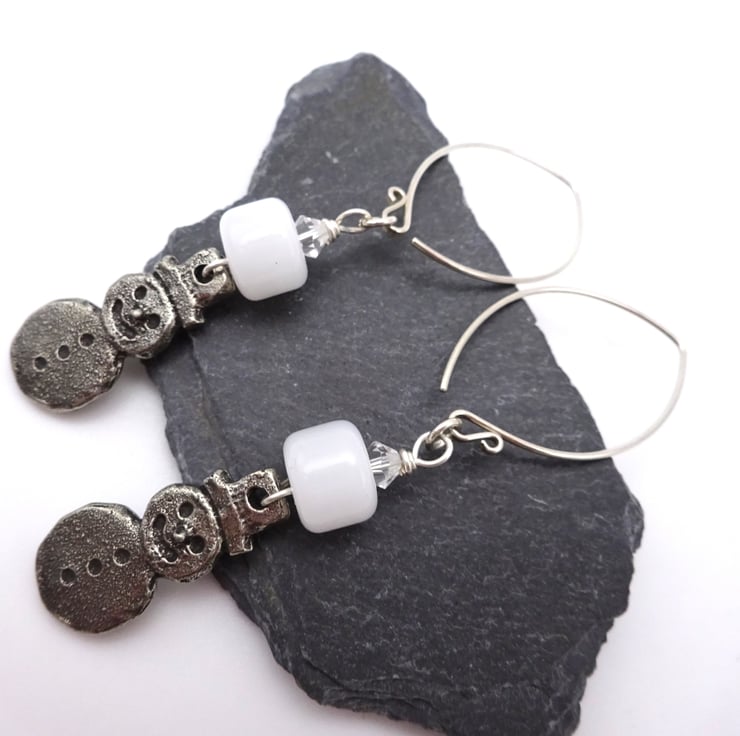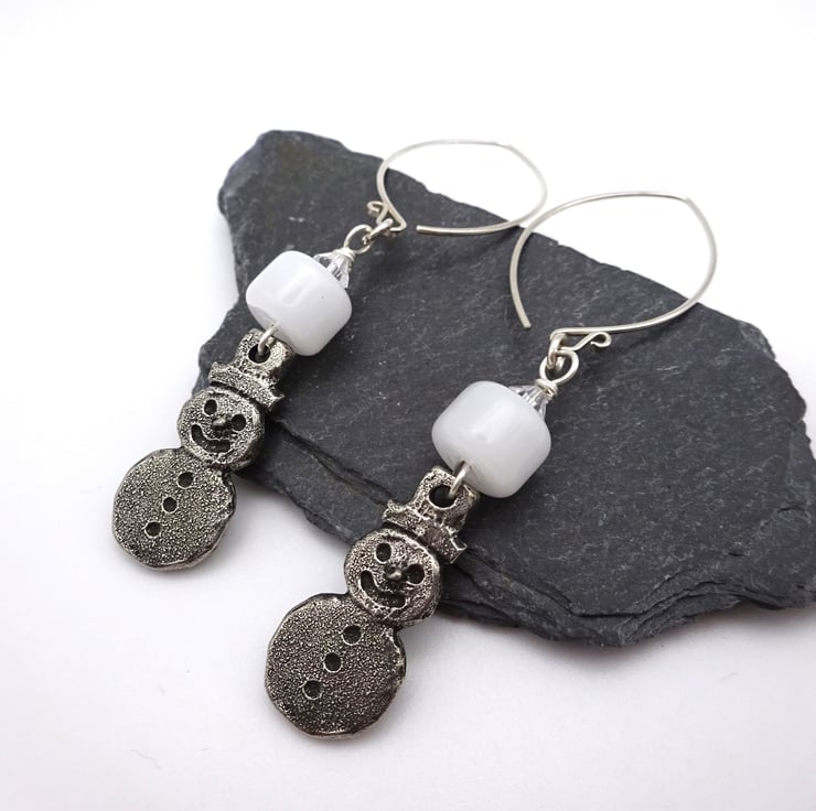 A pair of earrings made using handmade sterling silver ear wires, crystal beads, handmade white lampwork glass beads and handmade pewter snowman charms.