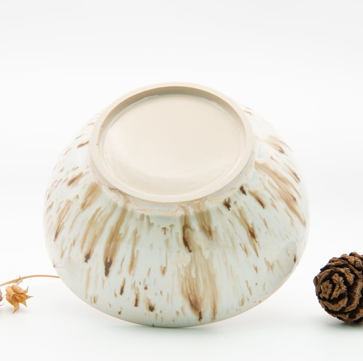 Finished on the inside with a pure white glaze and on the outside with cream / white glaze with dripping brown streaks.