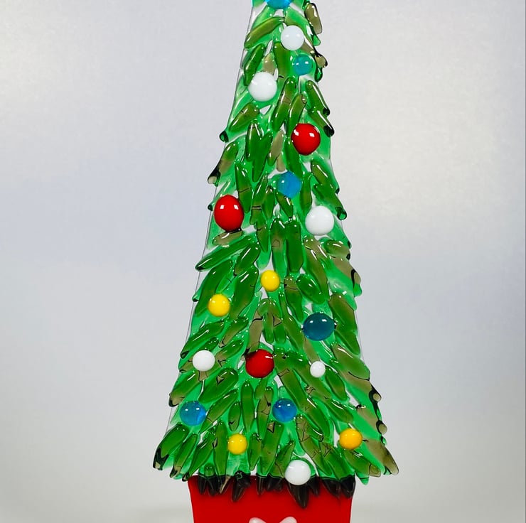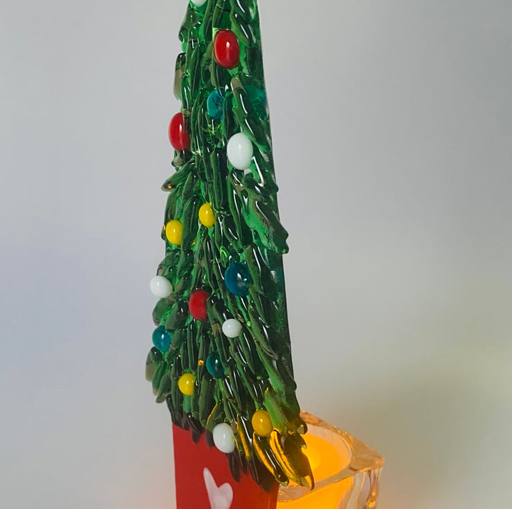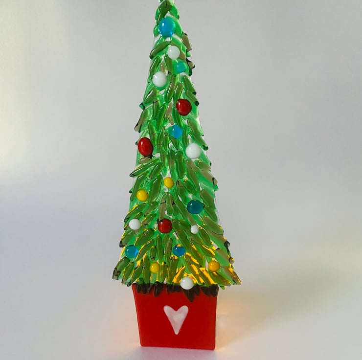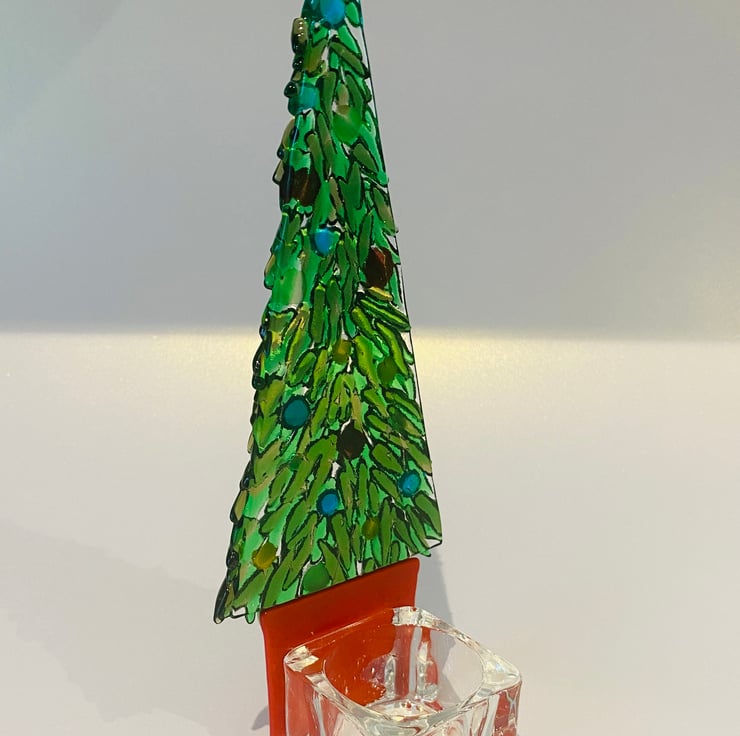 Gorgeous fused glass Christmas tree decoration with heart detail . A lovely addition to your Christmas decorations or a special hand crafted gift . Each are totally unique and created over 2 firings . This one stands 9 inches high so is perfect for your windowsill or mantle . Back light with a candle for additional nighttime interest .