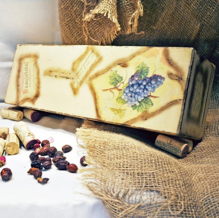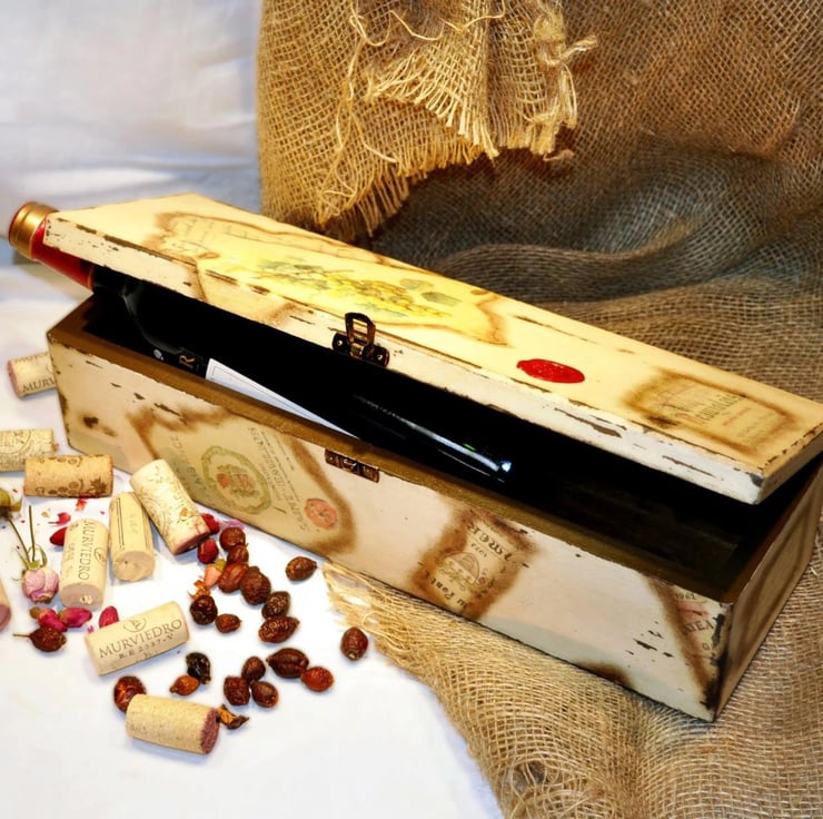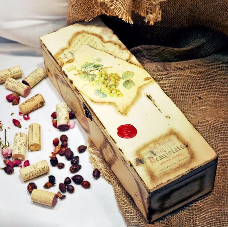 Featuring a refined decoupage decoration, a stained and wax-polished interior, and an imitation sealing wax stamp on the front, this wine box exudes vintage sophistication. Its durable, non-toxic materials ensure safe and stylish storage, making it ideal for both gift presentation and keepsake use.
