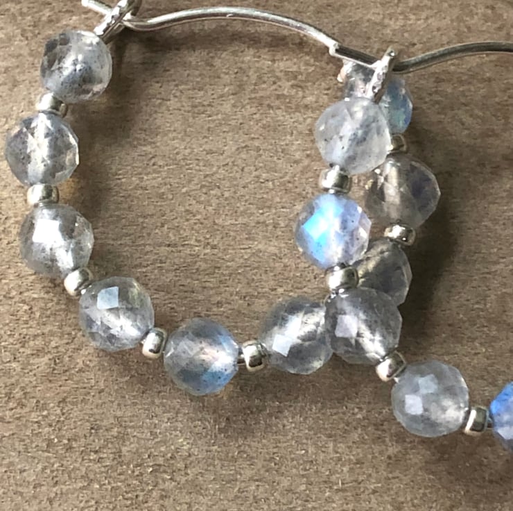 The earrings are made with twinkly faceted 4mm light grey Labradorite gemstone beads, that have some bright blue flash, and little silver Miyuki seed beads on handmade Sterling Silver hoops.