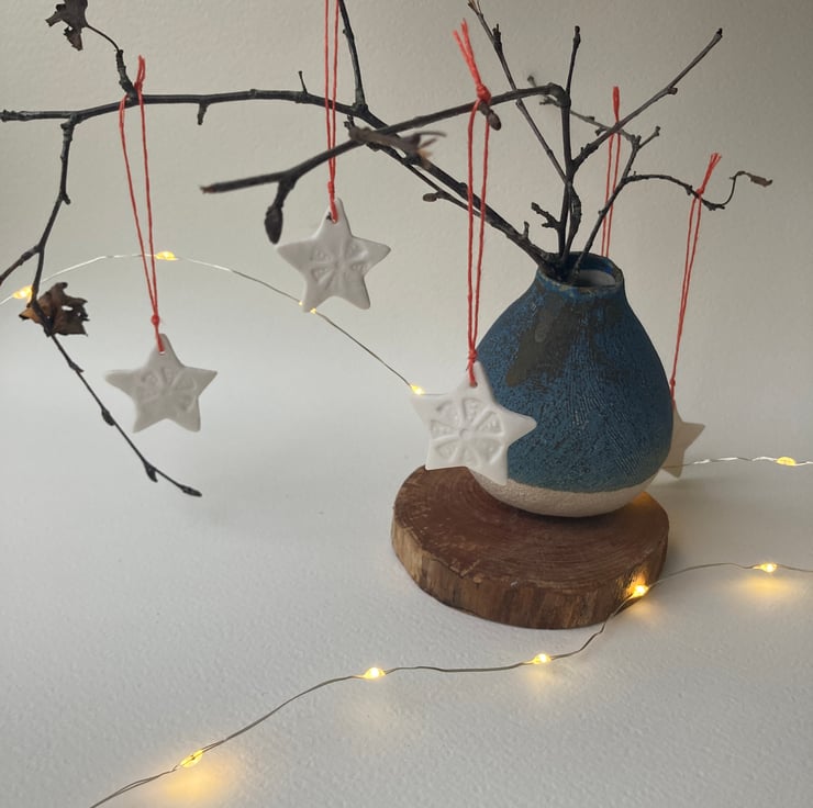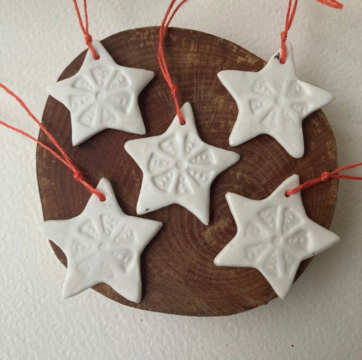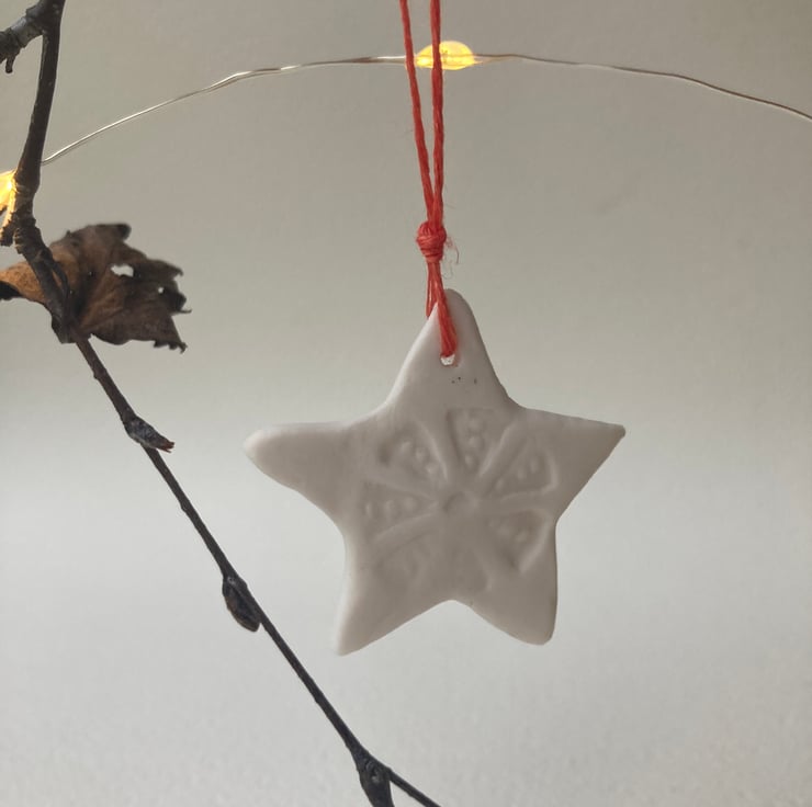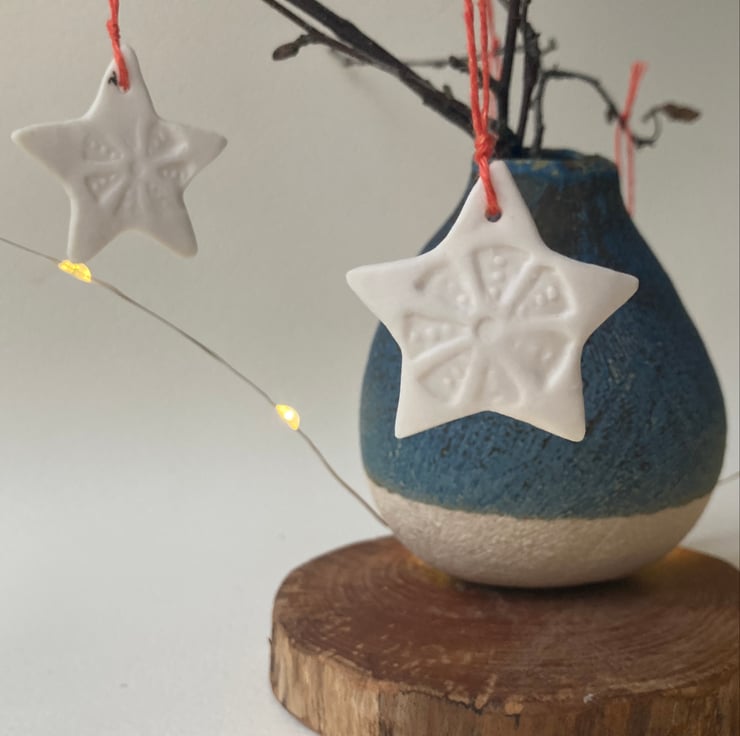 Stoneware fired porcelain, stamped with my own designed ceramic stamp. Simply threaded with warm red linen.