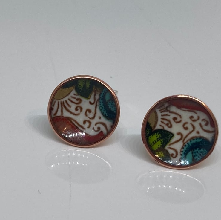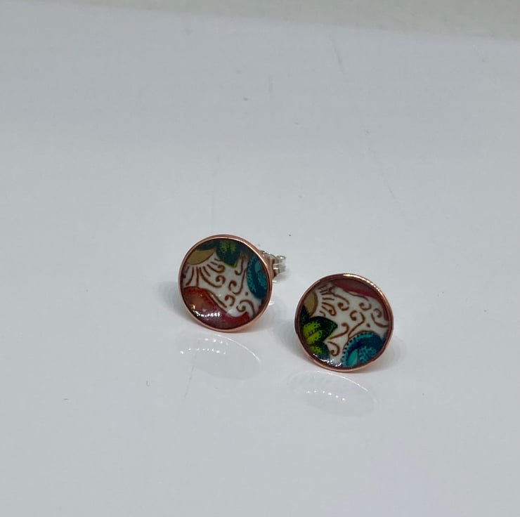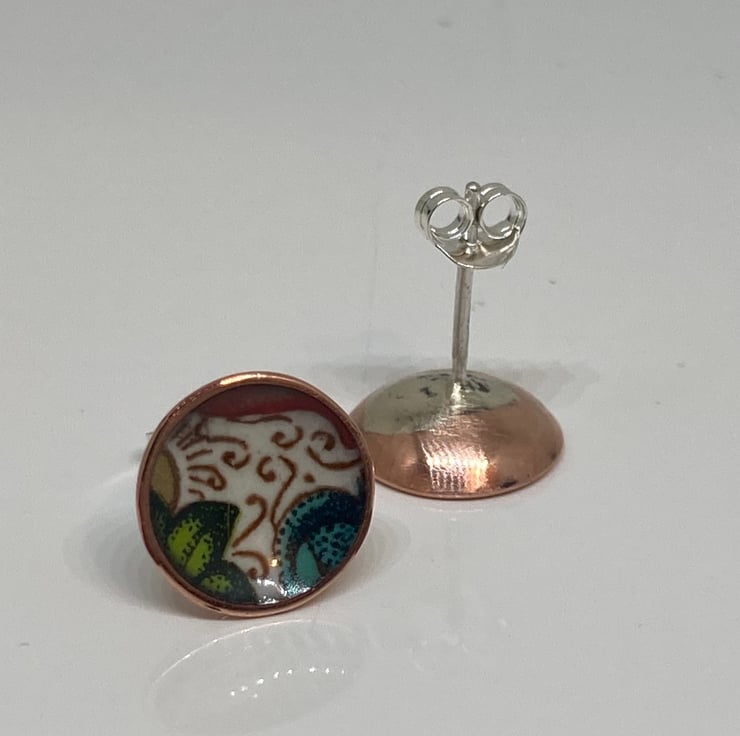 Enamelled copper stud earrings featuring part of an ornate pattern. The earring is concave with a natural copper finish on the back and has sterling silver posts and scrolls