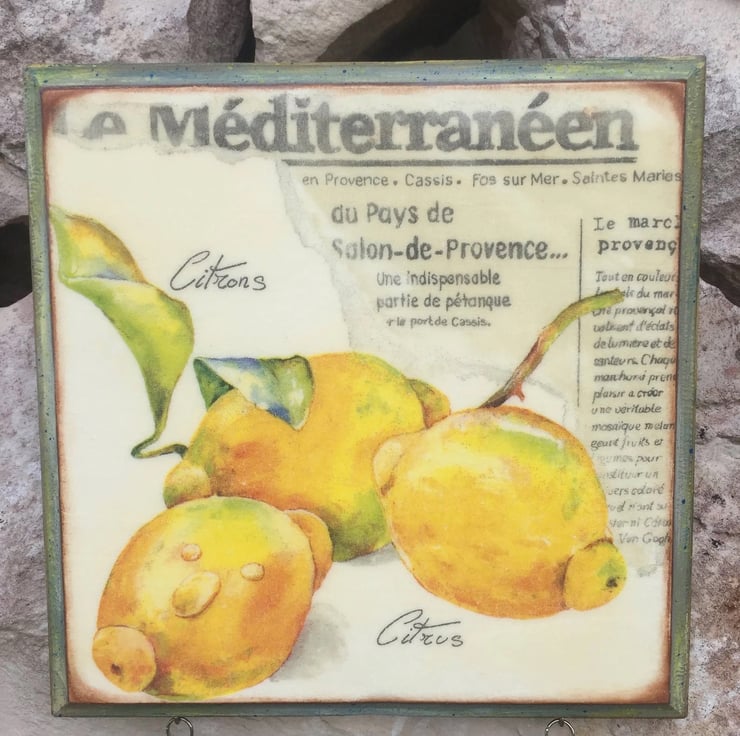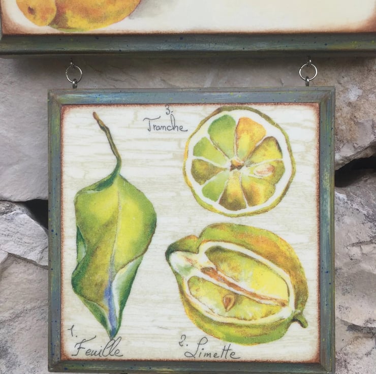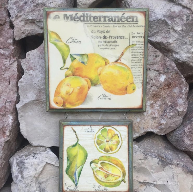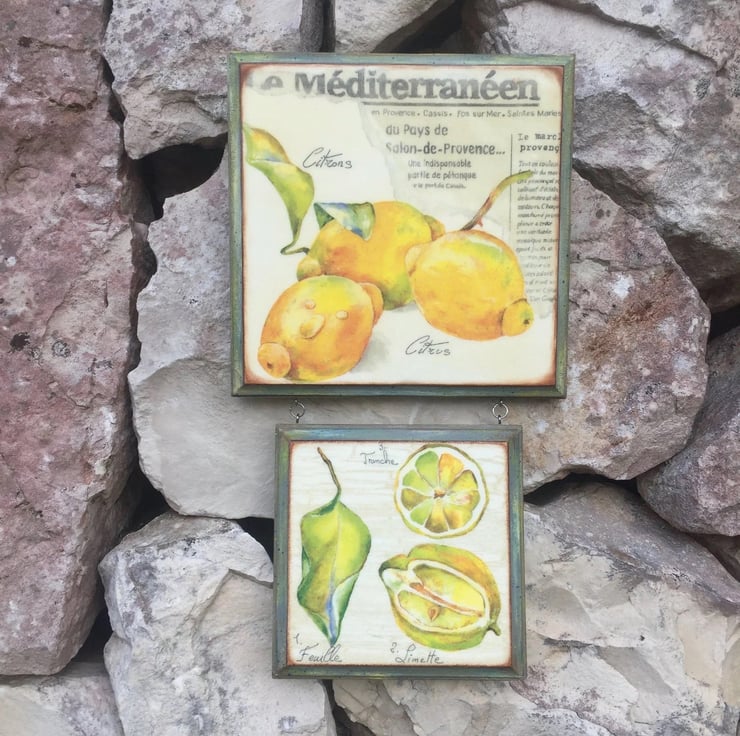 Add a touch of Mediterranean elegance to your home with this charming diptych of wooden pine signs, featuring a delightful citrus-inspired design created using the decoupage technique. Perfect for kitchens or country homes, these wall ornaments combine rustic charm with vintage sophistication.