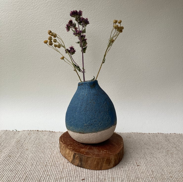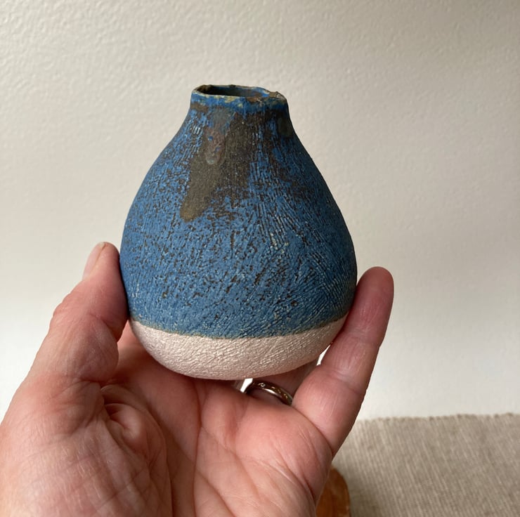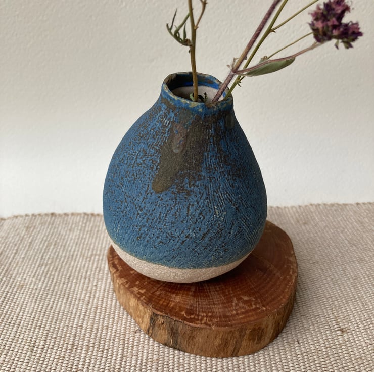 A stoneware vase, pleasant to hold. Dry blue glaze on the outside and a shiner one inside.